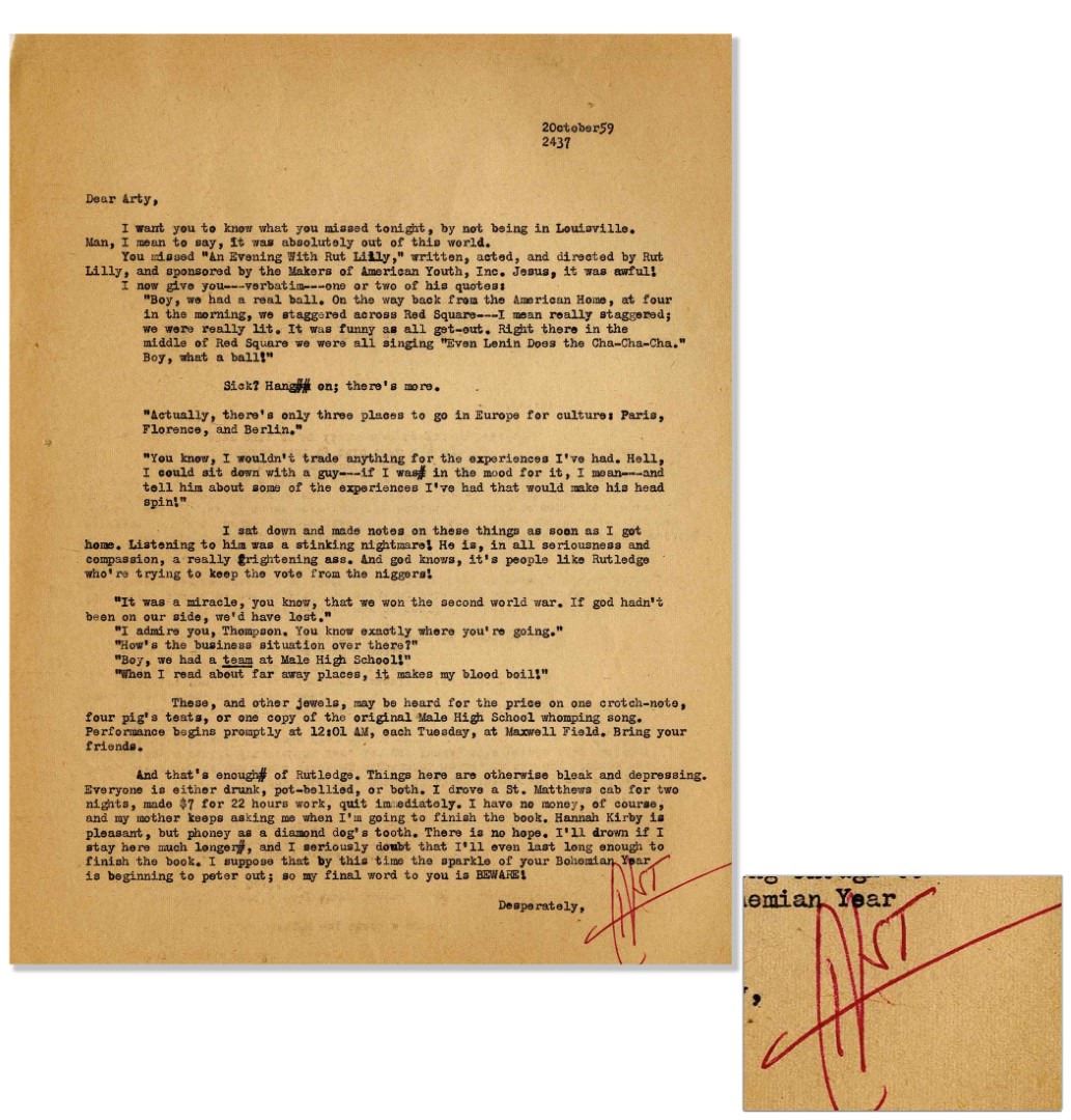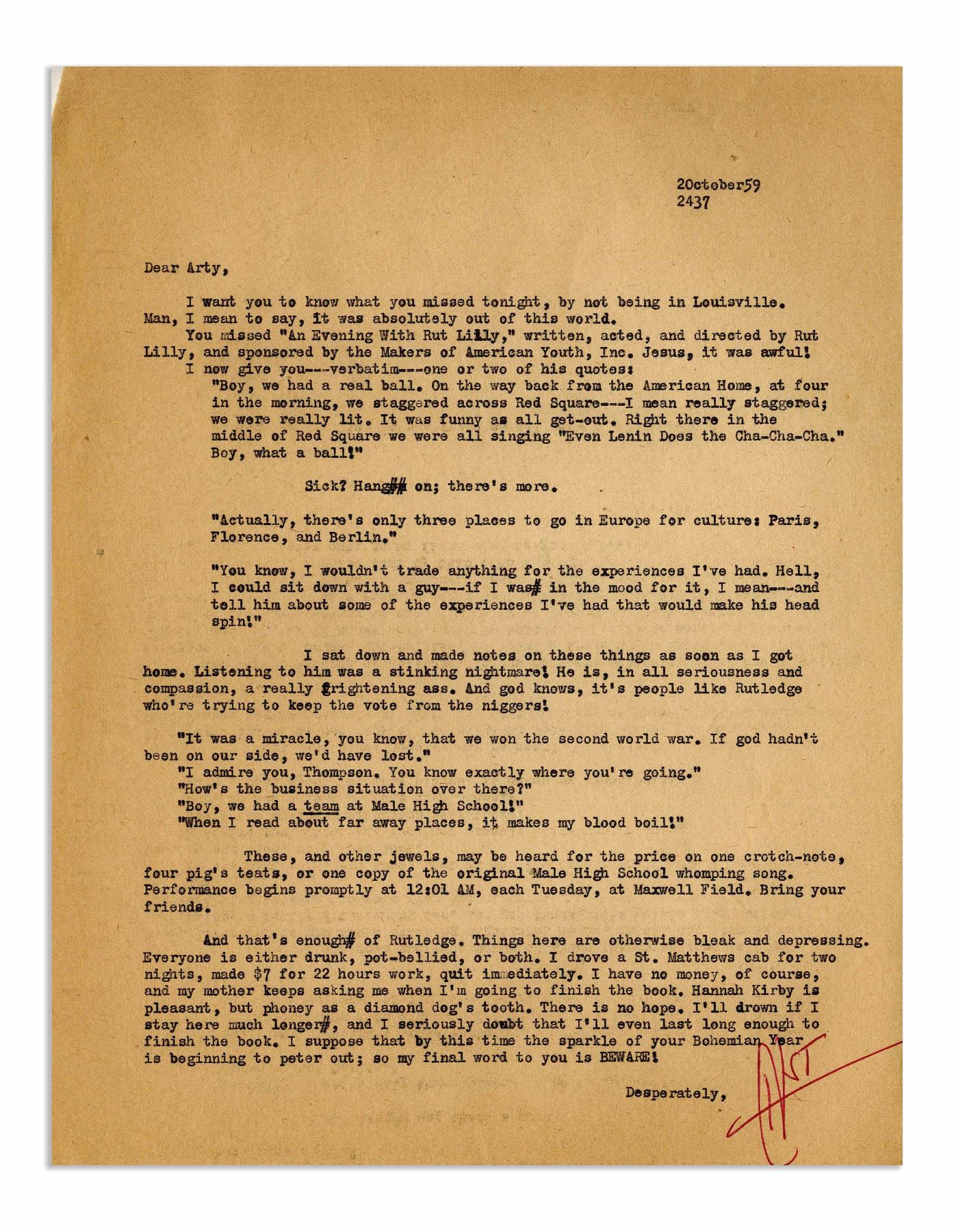 Hunter S. Thompson typed letter signed from late 1959, when Thompson lived at home for a few months after working at ''Time'' magazine in New York. Signed ''HST'' in bold red pen, Thompson here writes to his high school friend Paul Semonin, entertaining him with stories of mutual friends and life in Louisville, Kentucky. Dated 2 October 1959, letter reads in part, ''I want you to know what you missed tonight, by not being in Louisville. Man, I mean to say, it was absolutely out of this world. / You missed 'An Evening With Rut Lilly,' wirtten, acted, and directed by Rut Littly, and sponsored by the Makers of American Youth, Inc. Jesus, it was awful!...I sat down and made notes on these things as soon as I got home. Listening to him was a stinking nightmare! He is, in all seriousness and compassion, a really frightening ass. And god knows, it's people like Rutledge who're trying to keep the vote from the niggers!...'' Thompson reveals humorous quotes from their friend, including ''...'Right there in the middle of Red Square we were all singing 'Even Lenin Does the Cha-Cha-Cha.' Boy what a ball!'...'It was a miracle, you know, that we won the second world war. If god hadn't been on our side, we'd have lost.' / 'I admire you, Thompson. You know exactly where you're going.'...'' Thompson then continues, ''...These, and other jewels, may be heard for the price on one crotch-note, four pig's teats, or one copy of the original Male High School whomping song...Things here are otherwise bleak and depressing. Everyone is either drunk, pot-bellied, or both. I drove a St. Matthews cab for two nights, made $7 for 22 hours work, quit immediately. I have no money, of course, and my mother keeps asking me when I'm going to finish the book. Hannah Kirby is pleasant, but phoney as a diamond dog's tooth. There is no hope. I'll drown if I stay here much longer, and I seriously doubt that I'll even last long enough to finish the book. I suppose that by this time the sparkle of your Bohemian Year is beginning to peter out; so my final word to you is BEWARE! / Desperately, [signed] HST''. Single page letter measures 8.5'' x 11''. Uniform toning, else near fine condition.