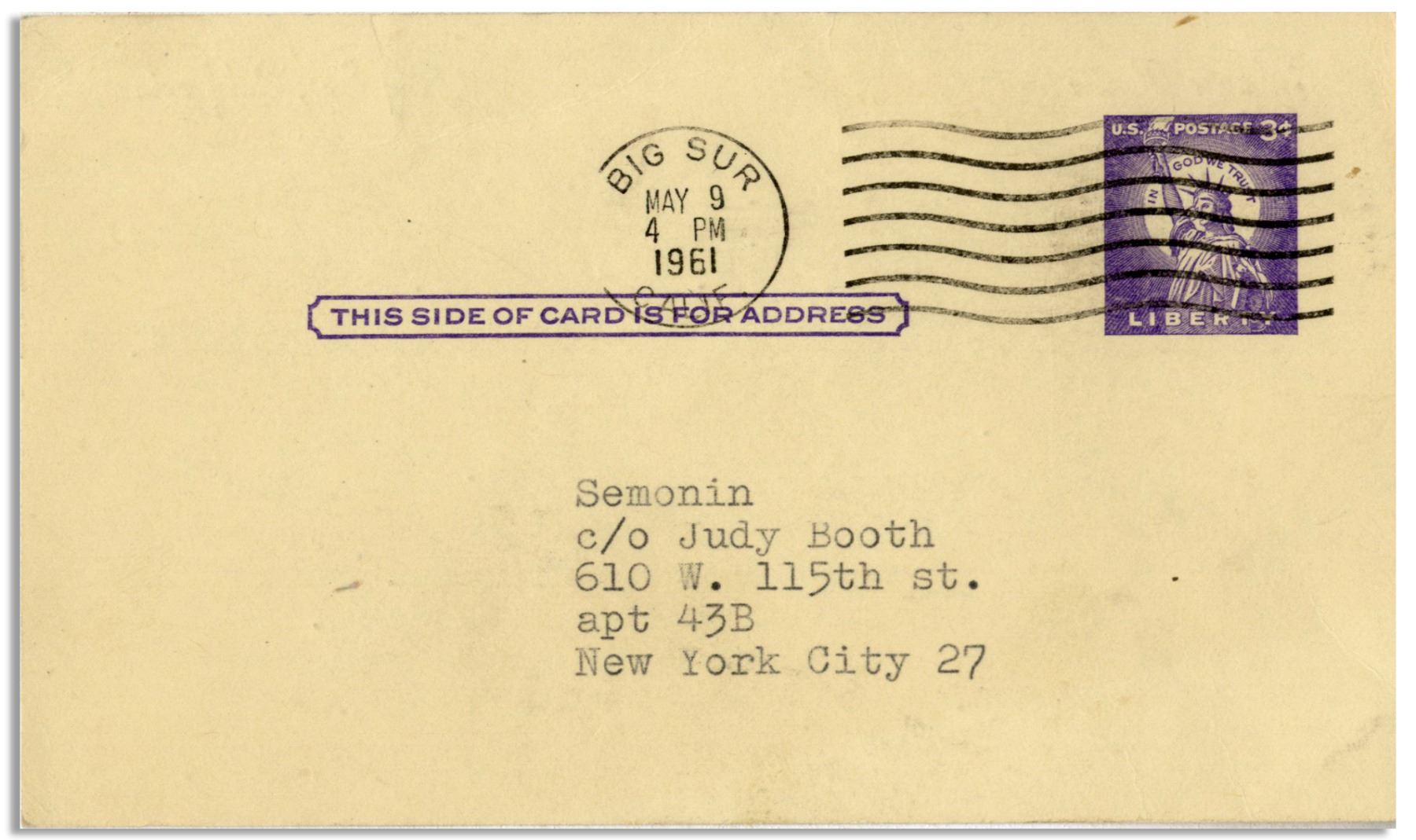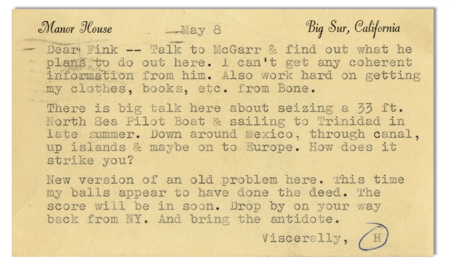 Hunter S. Thompson postcard signed ''H'' in type with Thompson circling his initial. Written on a Manor House, Big Sur postcard on 8 May 1961, Thompson writes to his friend Paul Semonin about the pregnancy of Thompson's girlfriend Sandy Conklin. Postcard reads in part, ''...There is big talk here about seizing a 33 ft. North Sea Pilot Boat & sailing to Trinidad in late summer. Down around Mexico, through canal, up islands & maybe onto Europe. How does it strike you? / New version of an old problem here. This time my balls appear to have done the deed. The score will be in soon. Drop by an your way back from NY. And bring the antidote. / Viscerally, H''. Postcard measures 5.5'' x 3.25'', with postmark from Big Sur on 8 May 1961. Near fine condition.