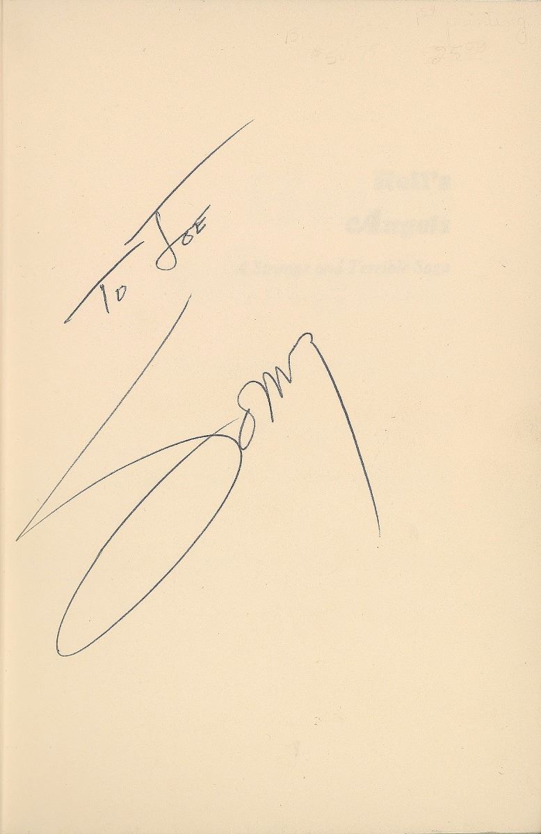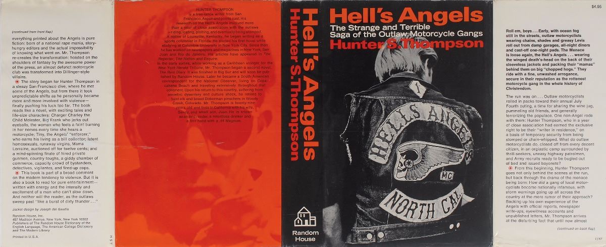 Signed book: Hell’s Angels. First edition, first printing. NY: Random House, 1967. Hardcover with dust jacket, 6 x 8.5, 278 pages. Signed and inscribed on the first free end page in black ballpoint by Sonny Barge, founding member of the Oakland chapter of the Hells Angels Motorcycle Club, “To Joe, Sonny.” Also includes an unaffixed bookplate signed in black felt tip by Thomspon, “HST.” Autographic condition: fine. Book condition: VG+/VG+.