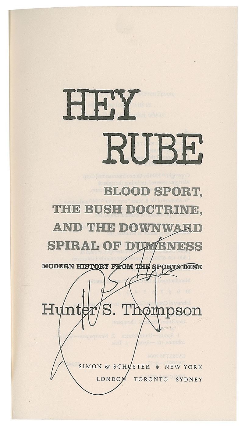 Signed book: Hey Rube. First edition. NY: Simon & Schuster, 2004. Hardcover with dust jacket, 5.5 x 9.5, 246 pages. Signed on the title page in black ink by Hunter S. Thompson. In very fine condition. Accompanied by a press release for a Thompson book signing at Book Soup in Santa Monica on October 18, 2004.