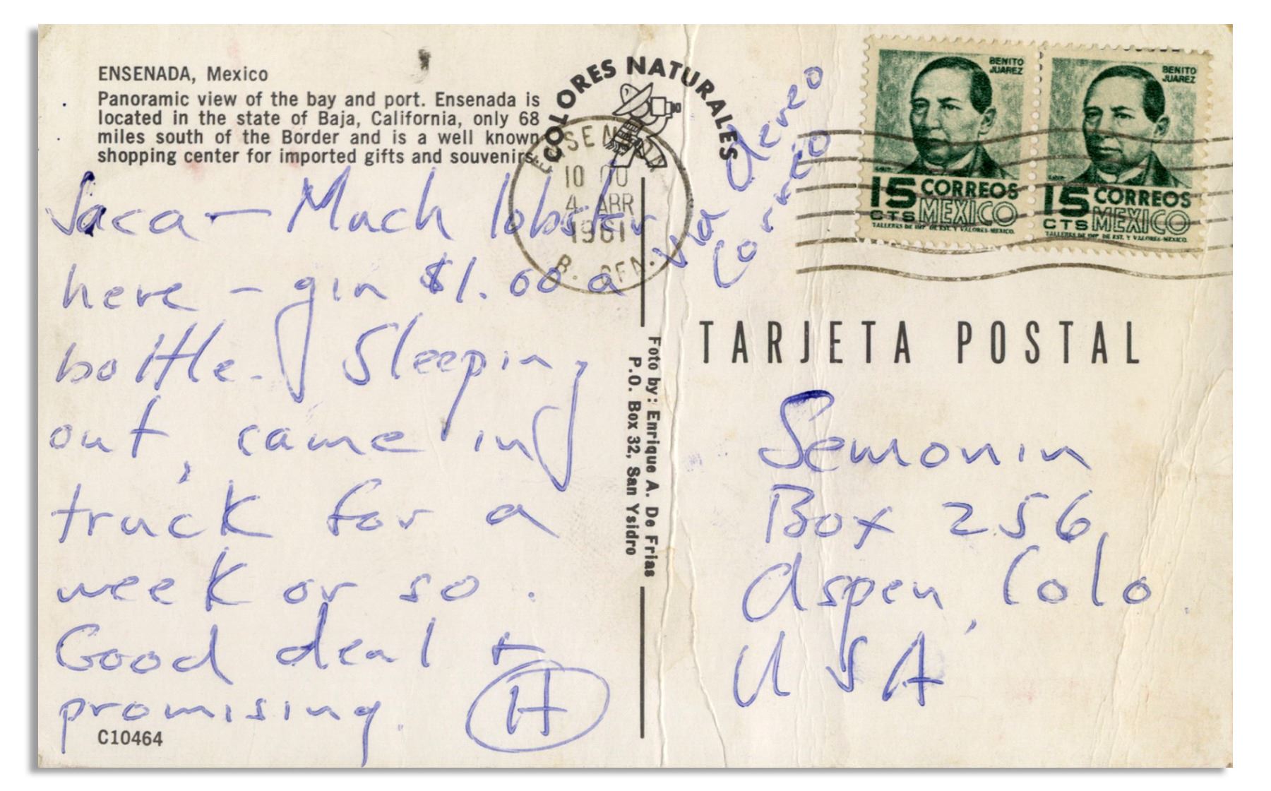 Hunter S. Thompson autograph letter signed, composed on the verso of a postcard of Ensenada, Mexico. Postmarked 4 April 1961, letter to his friend Paul Semonin reads, ''Jaca - Much lobster here - gin $1.000 a bottle. Sleeping out, came in truck for a week or so. Good deal & promising. H''. Postcard measures 5.5'' x 3.5''. Some creasing, in very good condition.