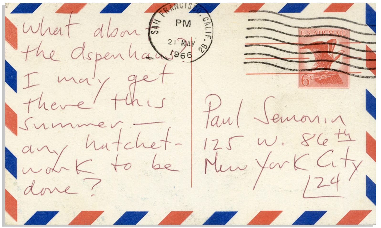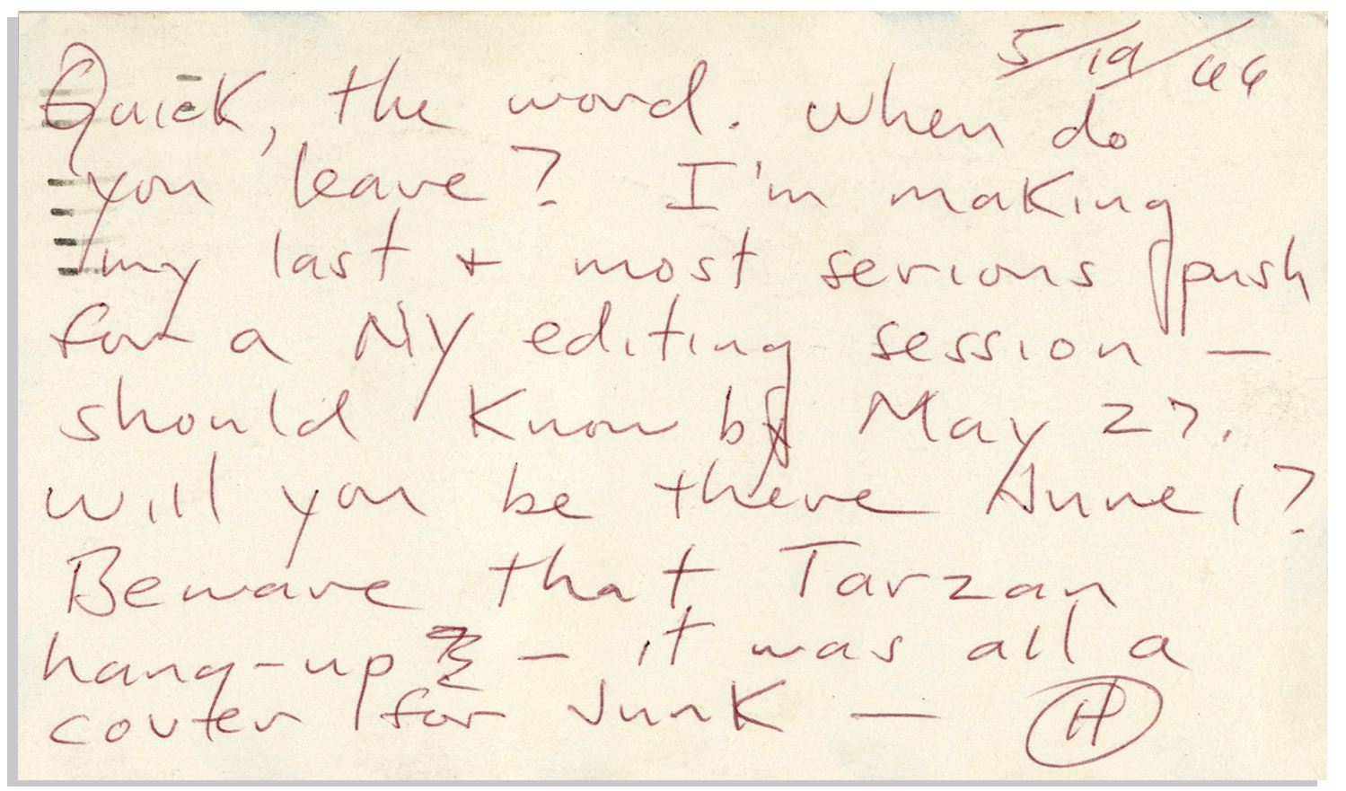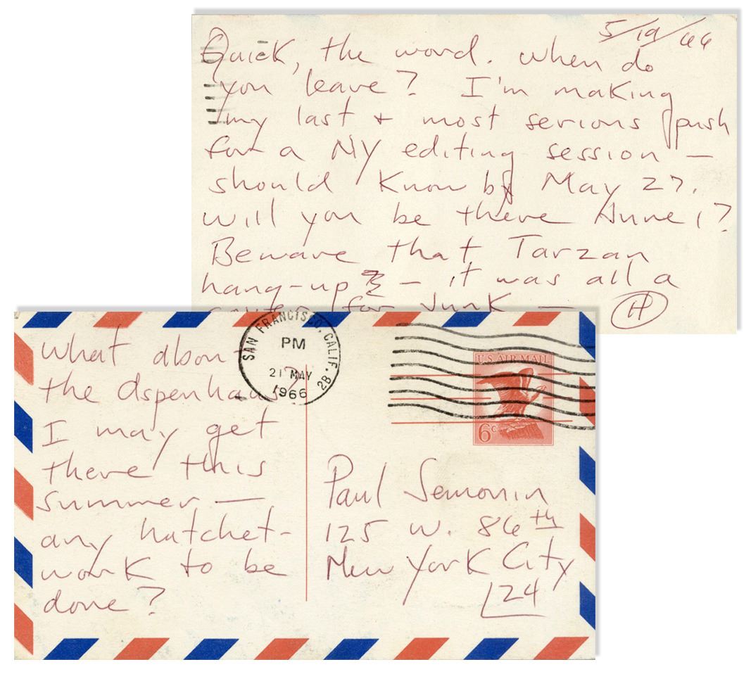 Hunter S. Thompson autograph letter signed on a postcard dated 19 May 1966, shortly after he completed ''Hell's Angels: The Strange and Terrible Saga of the Outlaw Motorcycle Gang''. Postmarked from San Francisco, letter to Paul Semonin references his friend's upcoming trip to the Congo and ends with a cryptic note about a ''Tarzan hang-up''. Letter reads in full, ''What about the Aspenhaus? I may get there this summer - any hatchet-work to be done? Quick, the word. When do you leave? I'm making my last + most serious push for a NY editing session - should know by May 27. Will you be there June 1? Beware that Tarzan hang-up - it was all a cover for Junk - H''. Postcard measures 5.5'' x 3.25''. Very good to near fine condition.