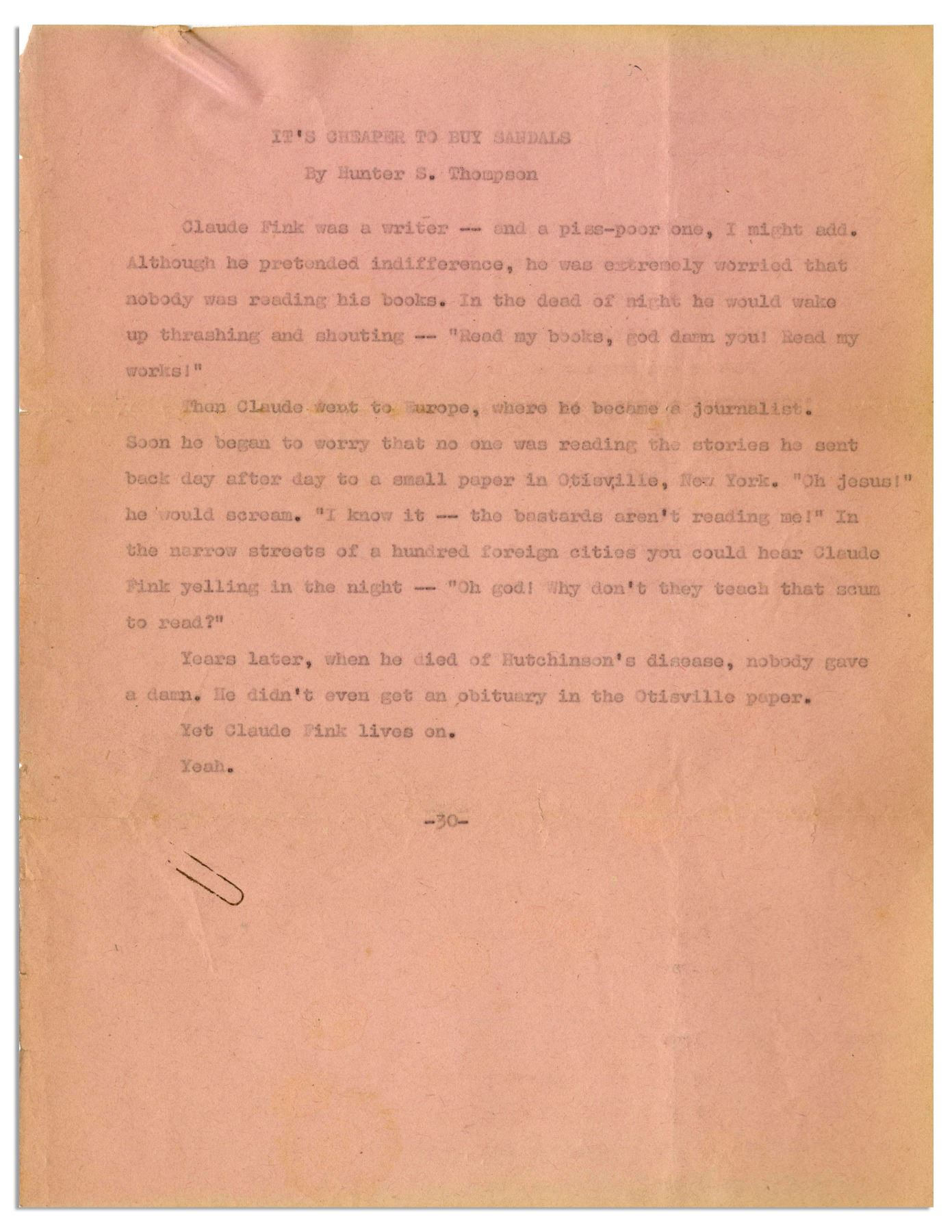 Letter is accompanied by the Claude Fink story, entitled ''It's Cheaper to Buy Sandals / by Hunter S. Thompson''. Claude Fink, of course, is Thompson's fictional character who famously tells author Henry Miller in ''Big Sur: The Tropic Of Henry Miller'', that he's ''come to join the cult of sex and anarchy.'' In this short story, ''Claude Find was a writer - and a piss-poor one, I might add. Although he pretended indifference, he was extremely worried that nobody was reading his books...Then Claude went to Europe, where he became a journalist. Soon he began to worry that no one was reading the stories he sent back day after day to a small paper in Otisville, New York...Years later, when he died of Hutchinson's disease, nobody gave a damn. He didn't even get an obituary in the Otisville paper. Yet Claude Fink lives on. Yeah.''
