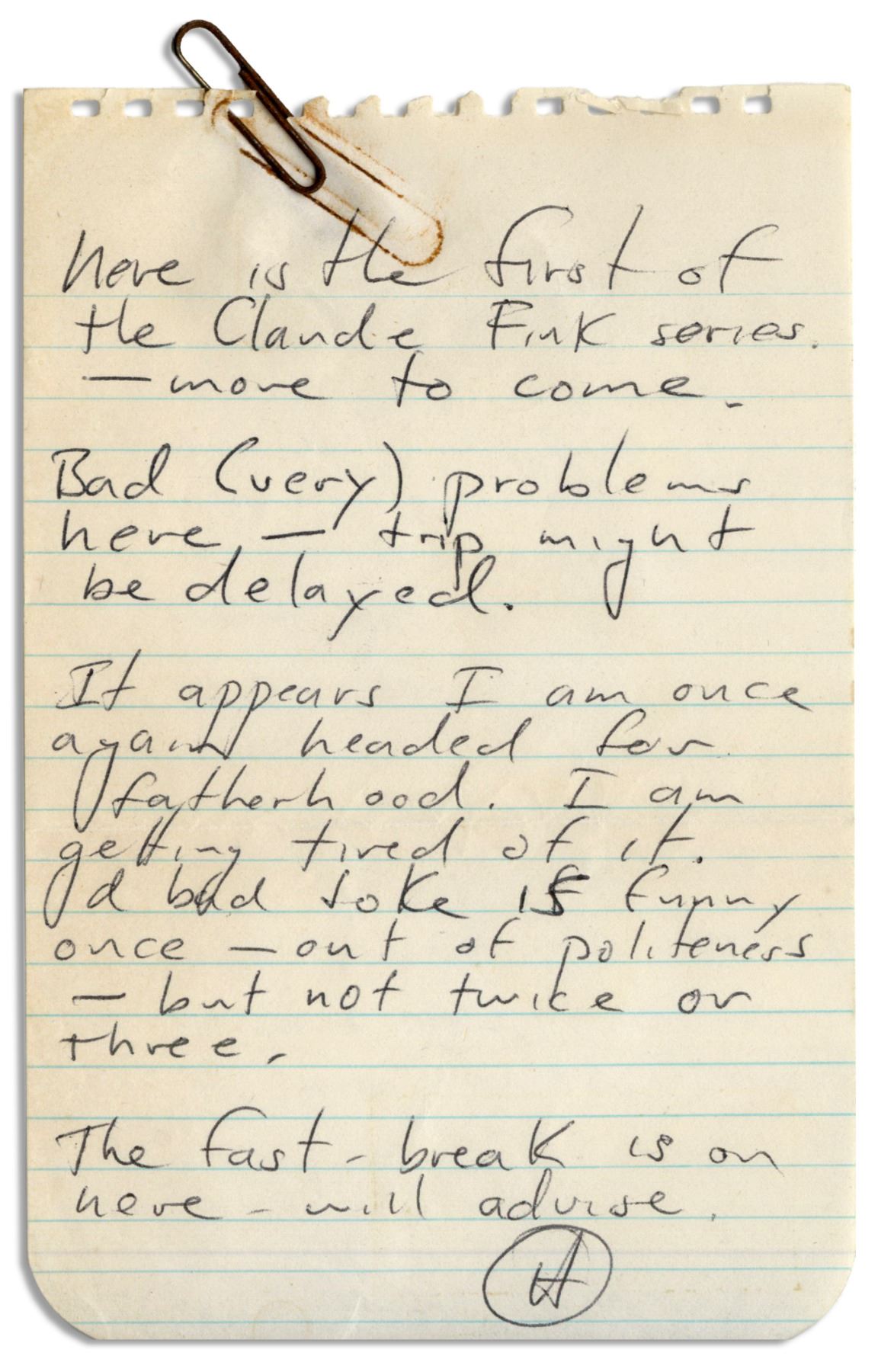 Hunter S. Thompson pair of documents: a short story featuring his fictional protagonist Claude Fink, and also an autograph letter signed regarding his impending fatherhood. Written sometime in early 1961 to his friend Paul Semonin, letter reads in full, ''Here is the first of the Claude Fink series - more to come. Bad (very) problems here - trip might be delayed. It appears I am once again headed for fatherhood. I am getting tired of it. A bad joke IS funny once - out of politeness - but not twice or three. The fast-break is on here - will advise. H''.