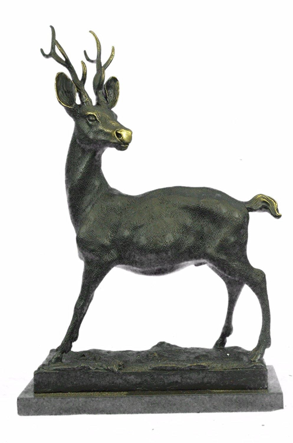 A hunter's prize. A undergraduate in the open land as he sits. His antlers curl upwards. His body is smooth and lean. His legs curl beneath his warm body. His head snaps up as if hearing a subtle noise in the distance alerting him to incoming danger, the sound of a hunter's boot snapping a twig. This would make the perfect gift for any hunter, nature lover or country dweller. 100% bronze and handmade, this twotoned brown patina sculpture was cast using the Lost Wax Method. Bronze Dimensions with Marble Base: Height 15 X Width 10 inches. Weight: 12 LBS. Inventory: 54K02837