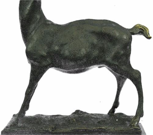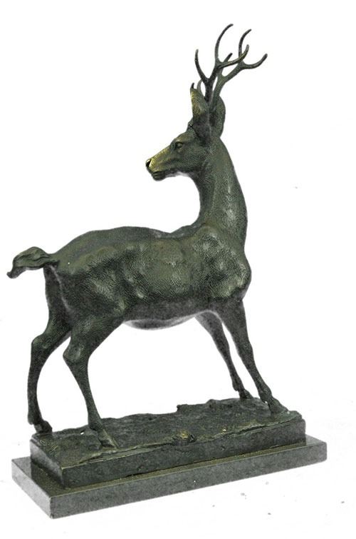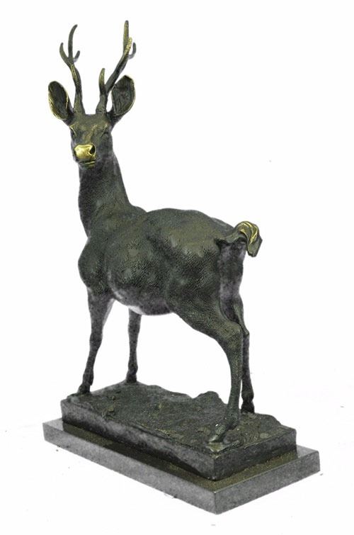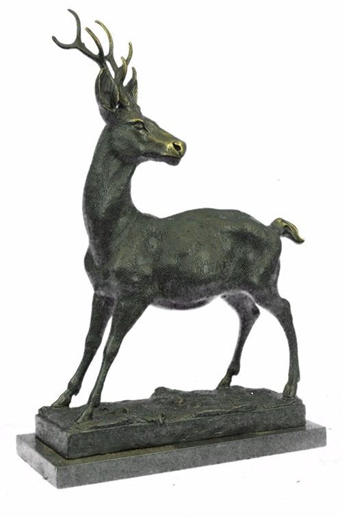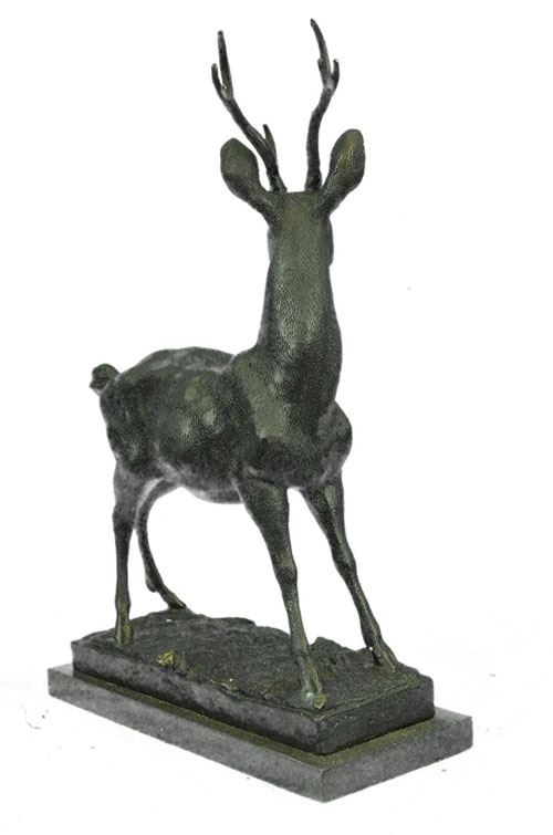 A hunter's prize. A undergraduate in the open land as he sits. His antlers curl upwards. His body is smooth and lean. His legs curl beneath his warm body. His head snaps up as if hearing a subtle noise in the distance alerting him to incoming danger, the sound of a hunter's boot snapping a twig. This would make the perfect gift for any hunter, nature lover or country dweller. 100% bronze and handmade, this two-toned brown patina sculpture was cast using the Lost Wax Method. Bronze Dimensions with Marble Base: Height 15 X Width 10 inches. Weight: 12 LBS. Inventory: 54K02837