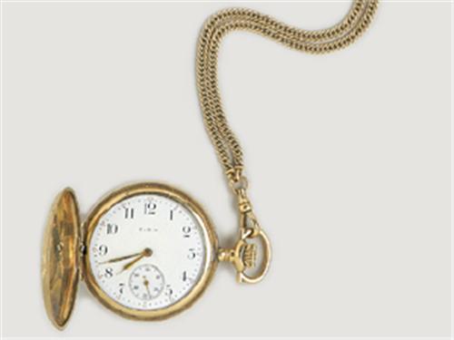 Gold-plated metal, engraved and guilloche decoration on the case, enamelled face with Arabic numerals and subsidiary seconds, lever watch with 17 jewels in working condition, face and movement are marked Elgin USA, flat link watch chain, circa 1930, case number: 858875, movement number: 1810760, gross weight: 122.3 g