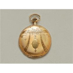 14 K gold, guilloche and engraved ribbon garland motif decoration on the case, metal face with Arabic numerals and subsidiary seconds, lever watch in working condition with 15 jewels, Switzerland, circa 1930, marked, gross weight: 66.0 g, the inside dust cover is missing.