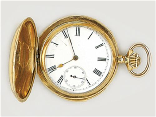 14 K gold case, on the front side B. R. initials with crown, on the backside engraved coat of arms, Enamelled face with Roman numerals and subsidiary seconds, lever watch in working condition, ¼ striking spiral gong, Switzerland, circa 1900, case number: 12564, gross weight: 102.3 g, it is difficult to open the front cover, broken glass, dented.