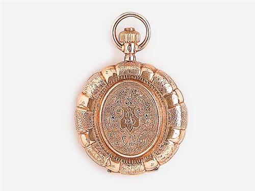 14 K gold, case with lobed border, engraved decoration and initials, inside the cover there is a compartment for a picture, enamelled face with Roman numerals and subsidiary seconds, cylinder watch in working condition, Switzerland, circa 1900, case numbe