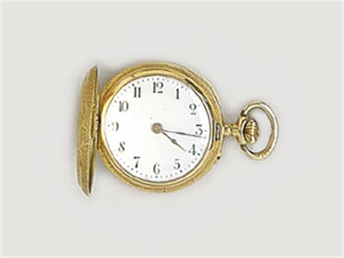 14 K gold, case with engraved decoration, B. M. initials, enamelled face with Arabic numerals, cylinder watch in working condition, Invicta sign, Switzerland, circa 1900, import mark, case number: 40981, gross weight: 16.1 g, metal ear, rest of enamel on the case.