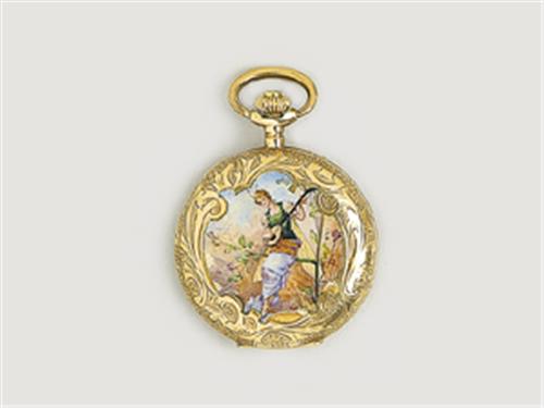 14 K gold, painted enamelled miniature on the front side, enamelled face with Roman numerals, cylinder watch with 10 jewels in working condition, circa 1900, import mark, case number: 212627, gross weight: 24.0 g, damaged enamel, replaced hand.