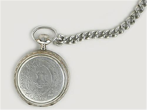 Silver, engraved and guilloche decoration on the case, Roman numerals and subsidiary seconds, cylinder watch in working condition, flat link chain, circa 1900, case number: 30619, gross weight: 108.0 g, incomplete chain, metal inside dust cover.