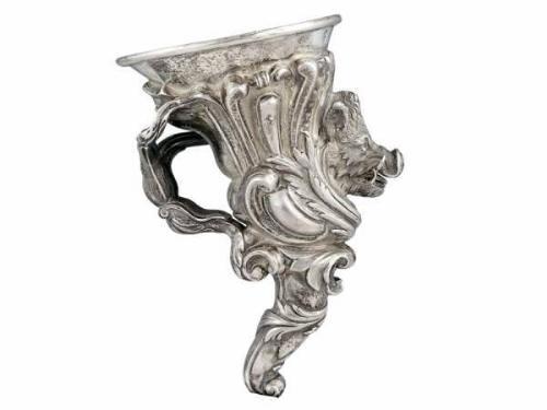 Silver, 338 g. Stylised neo-rococo horn of plenty, with boar head on it. Marked: Hungarian, Late 19th century, Liszth maker’s mark. Length: 19 cm