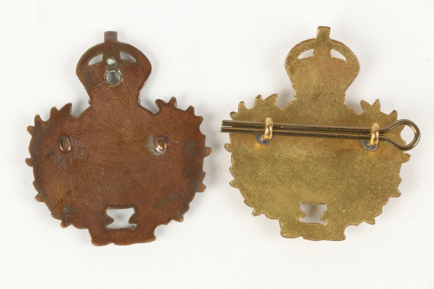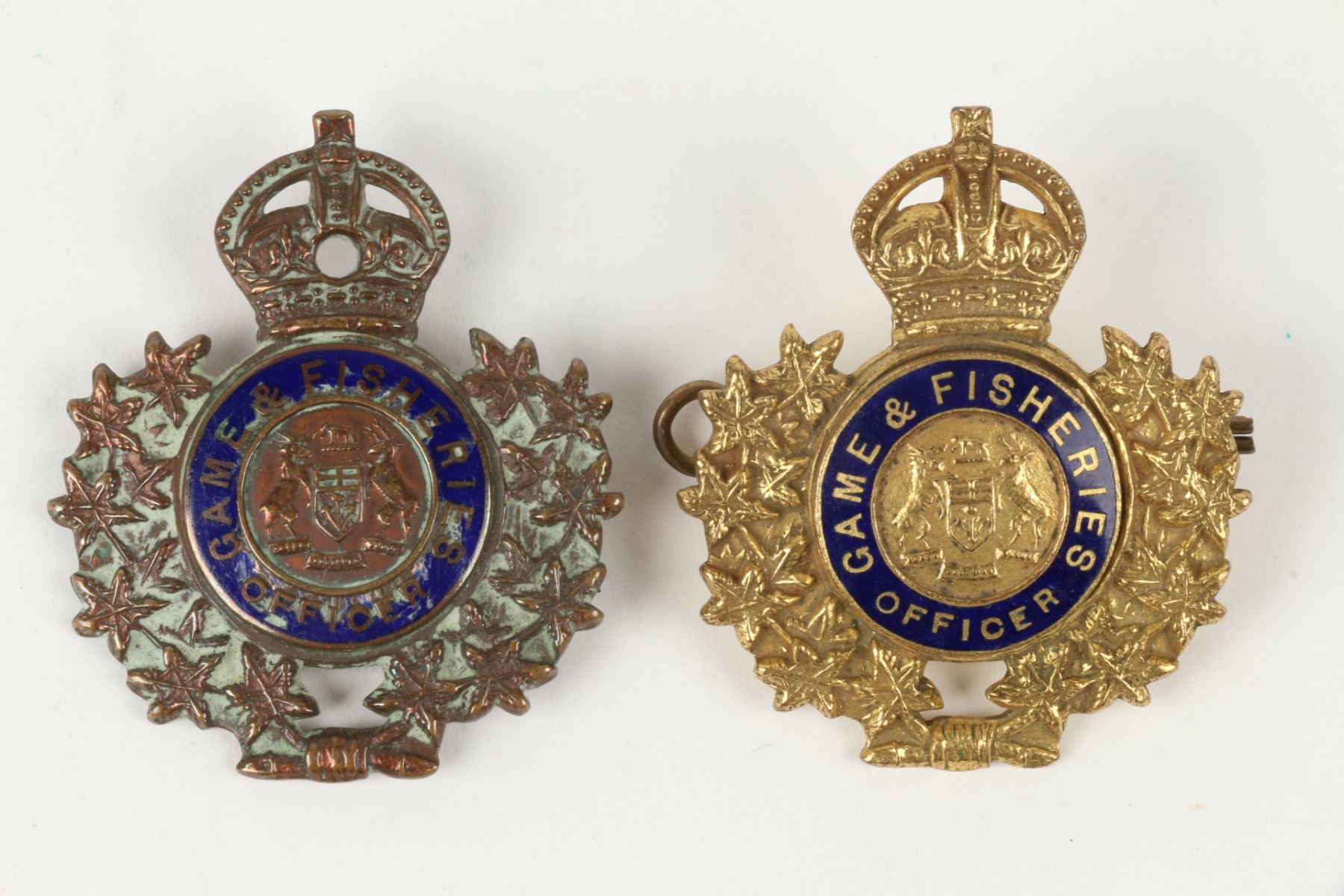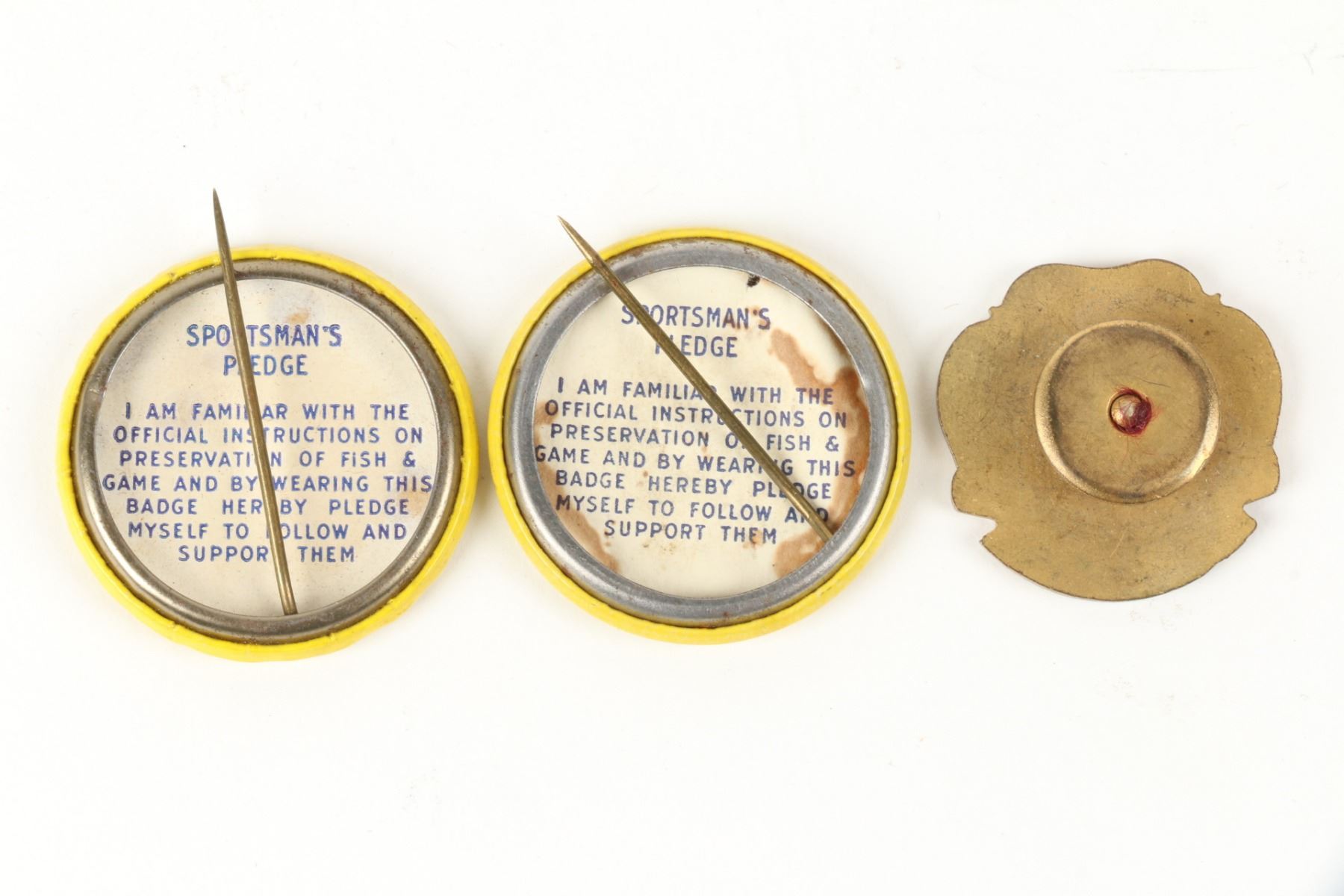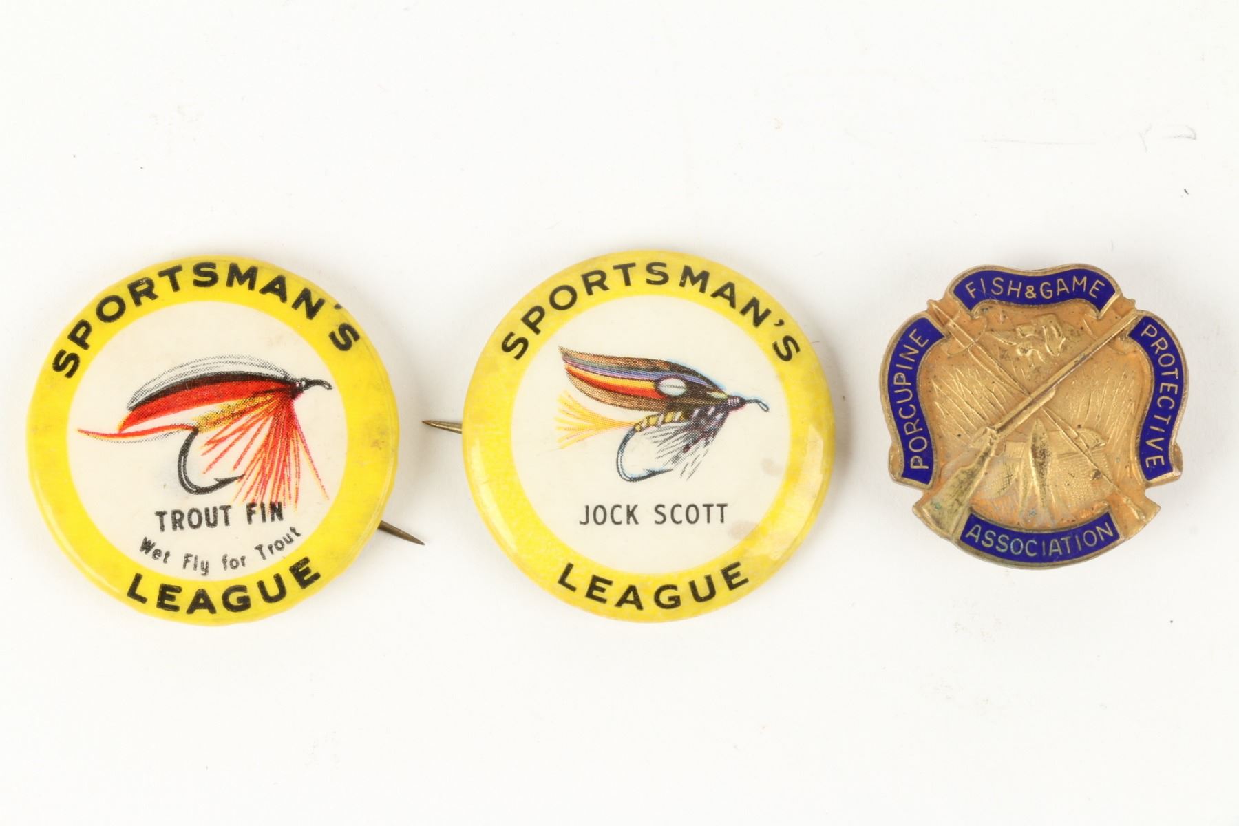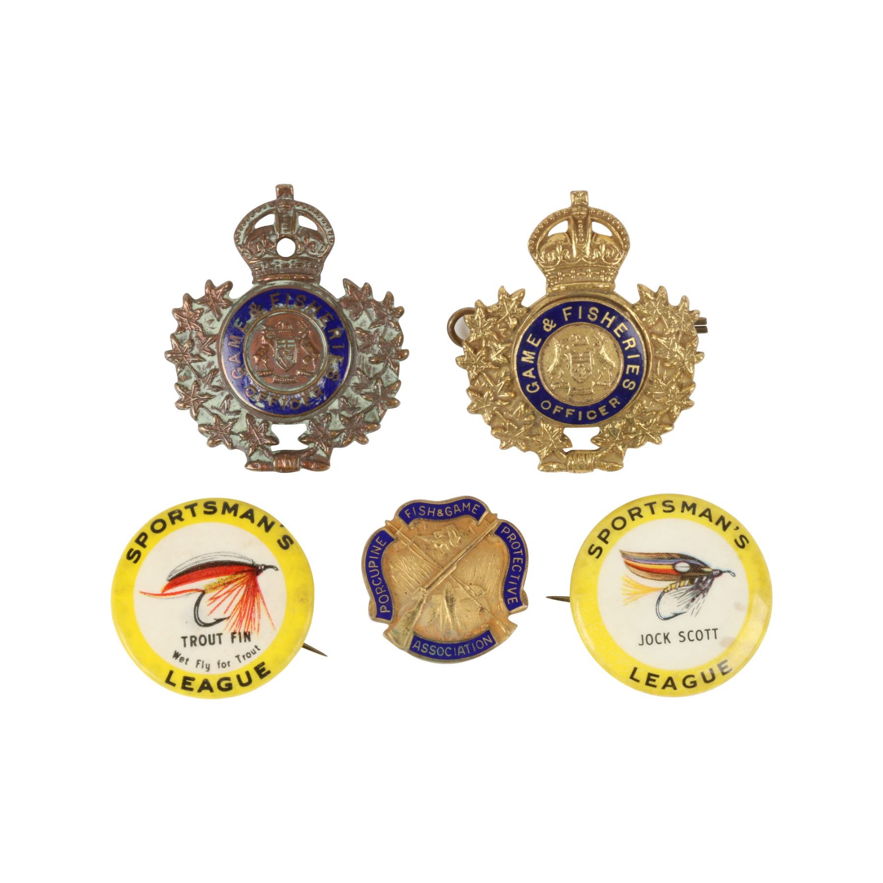 Five (5) items. Two (2) enamelled Game & Fisheries badges. One (1) porcupine, fish and game protective association badge. Two (2) sportsmen's league celluloid pinbacks. 1" to 2". Minor enamel loss and missing lugs on one officer badge. $200-300.