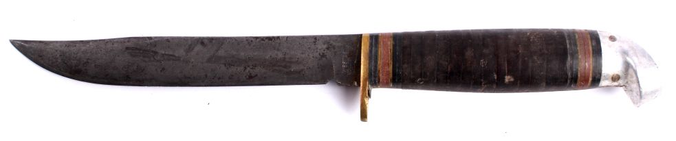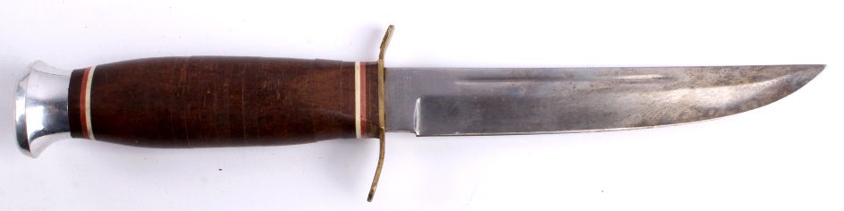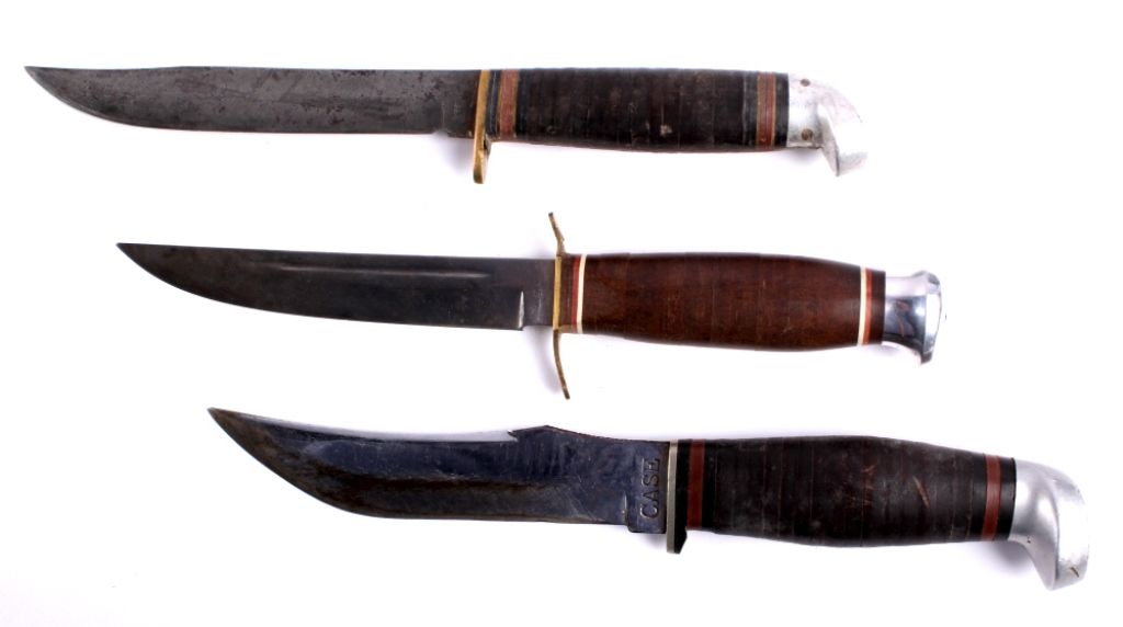 This lot includes three hunting knives. One is made by Case, one is a Western, and one is an Edge Mark. All the knives are in good condition. The Case and Western knives are both 9" with a 4.5" blade. The Edge Markknife is 8.75" with a 4.5" blade.