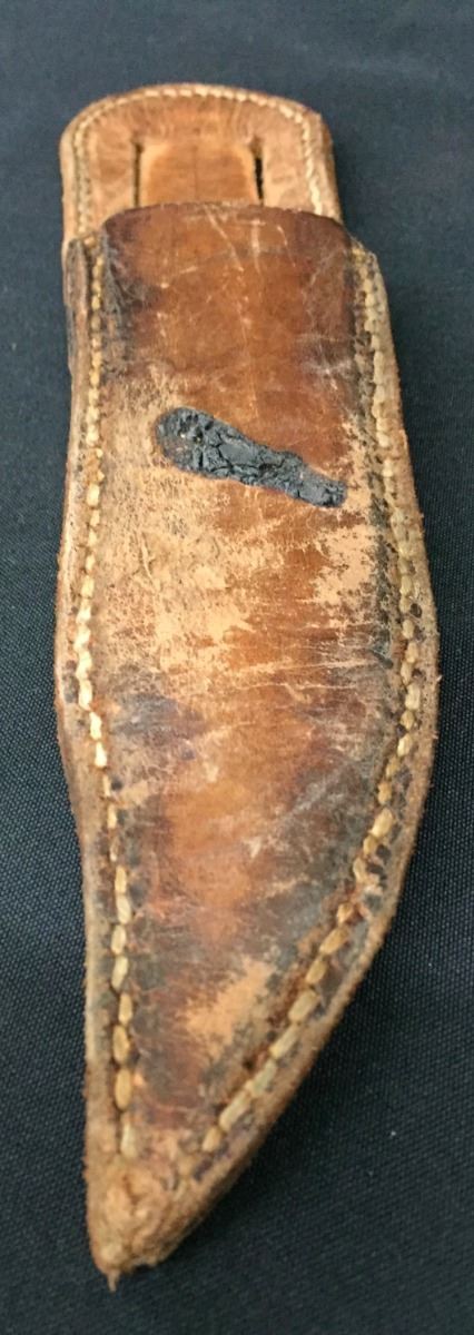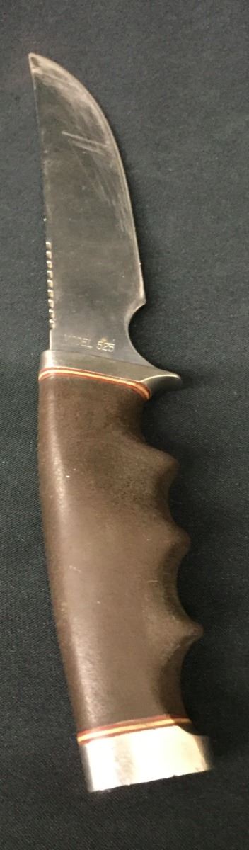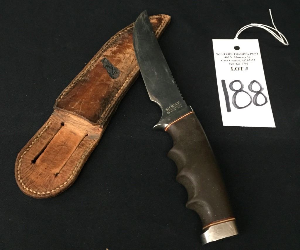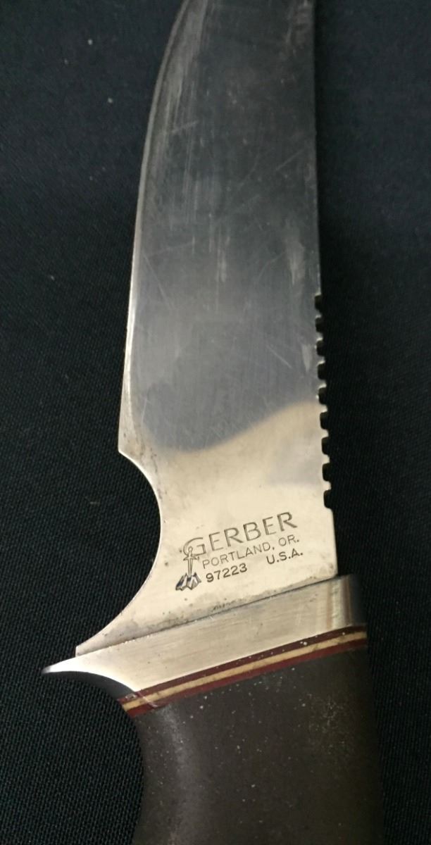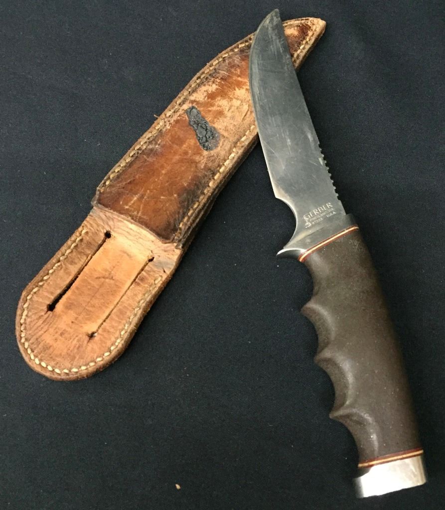 This Gerber brand hunting knife with leather sheath measures approximately 11 inches long overall. Please look closely at the pics as they are an important part of our description. Shipping: There will be a $5 handling / packaging fee for shipping this lot. The actual cost of postage will be added on top of that.