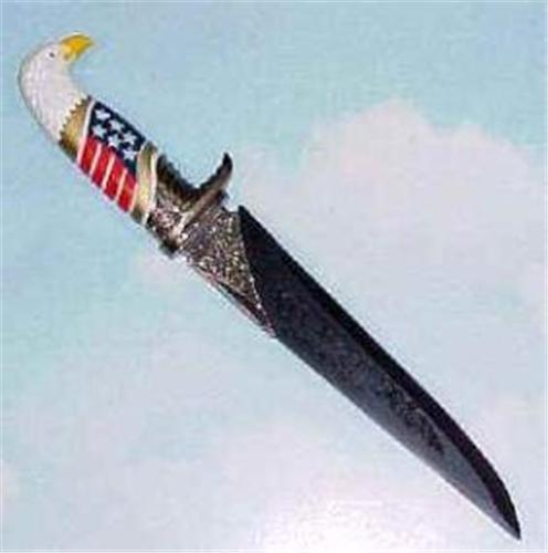 16-1/2" Eagle Bowie Knife Overall Length: 16-1/2" Blade Length: 10" Blade Material: Stainless Steel with Black Finish, Etched Handle Material: Ploymer with Vivid Colors Sheath: Custom Balistic Nylon