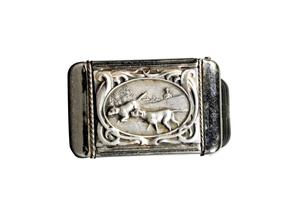 Match safe, nickel plated brass. Grouse on one side and dogs with hunter on opposite. Excellent condition. 2 1/4 X 1 3/8 inches.