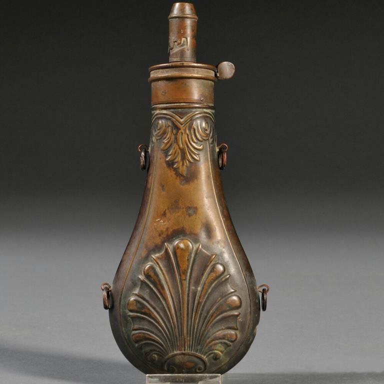 Hunting Powder Flask, c. mid-19th century, brass body with stamped designs, brass spout with measure, four iron loops attached to side for sling, lg. 8 1/2 in.