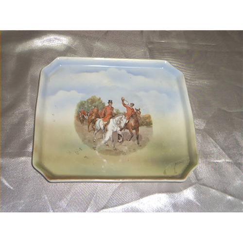 Hunting Scene Dish from Germany. In great condition and stamped Germany 293 in red on back of plate. It measures 7 1/2" X 6 1/2" X 1/2" H. Nice old one and a great add to any collection. GREAT GIFT ITEM FOR THE HOLIDAYS