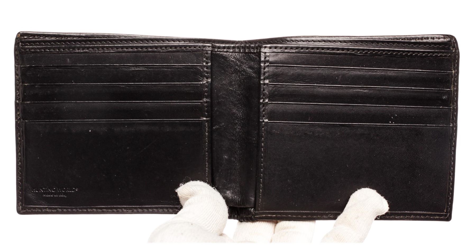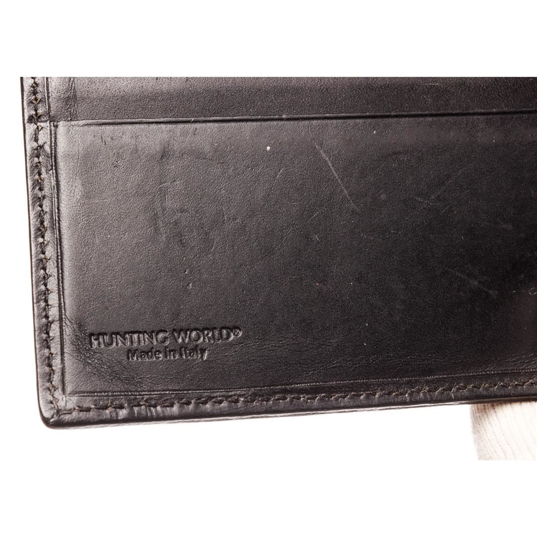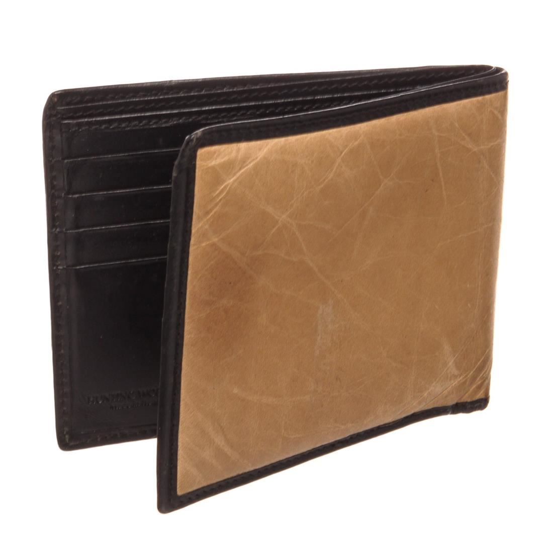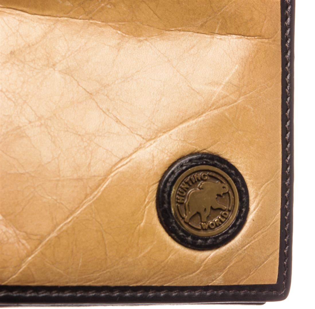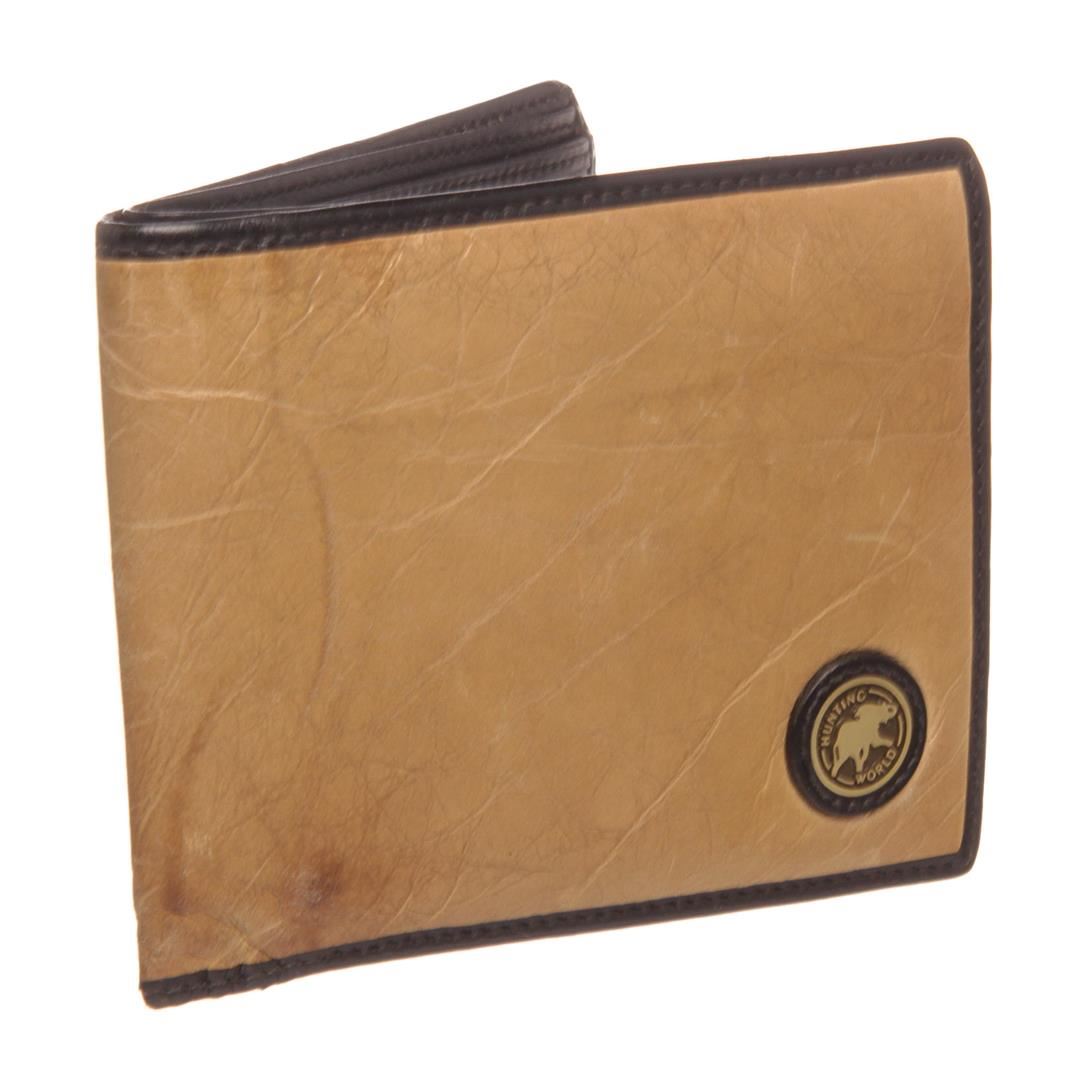 Hunting World beige leather bifold wallet with black leather lining, two bill pockets, dual side pockets, and eight card slots.