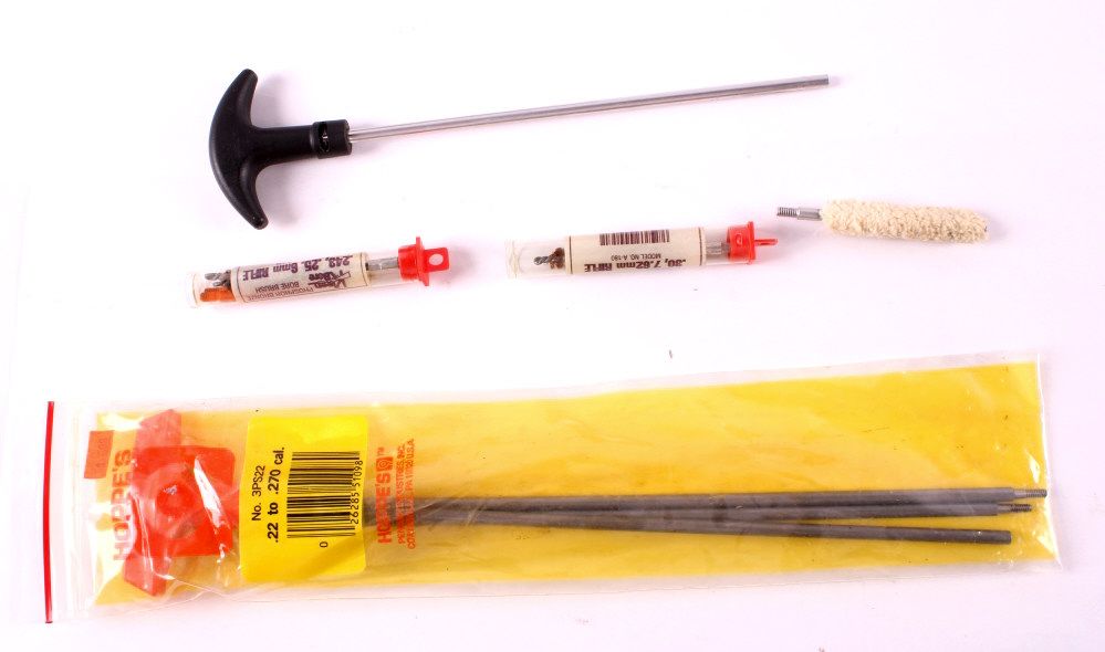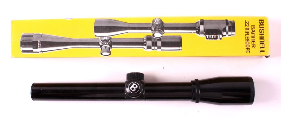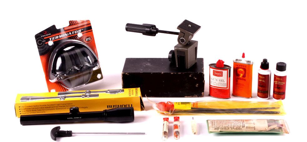 This lot features several hunting and shooting items. Included is a pair of earmuffs, a Bushnell car window mount, a Bushnell Banner .22 rifle scope, a wind meter, and numerous gun cleaning supplies.