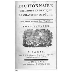[Hunting - fishing] - [DELISLE DE SALES, Jean-B. - Claude Izouard, attr.] - Dictionnaire théorique et pratique de chasse et de pêche. Paris, (P.A. le Prieur for) J.B.G. Musier fils, 1769,  2 vols., 12mo, contemp. marbled sheep (rubbed), elaborately gilt spine on 5 raised bands, [4]-lvij-[3]-475-[1], [4]-510-[2] pp. (minor traces of use).  Good set. € 120/200 Rare encyclopedia on hunting and fishing in 18th c. France, by Delisle de Sales (1739-1816).  On d5v-6v a stocklist of Musier.  Engr. illustrations on titlepages. Ref. Conlon, Siècle des Lumières 69:717 (4).  Cioranescu 22808.  Souhart 559.  Cfr. ill.