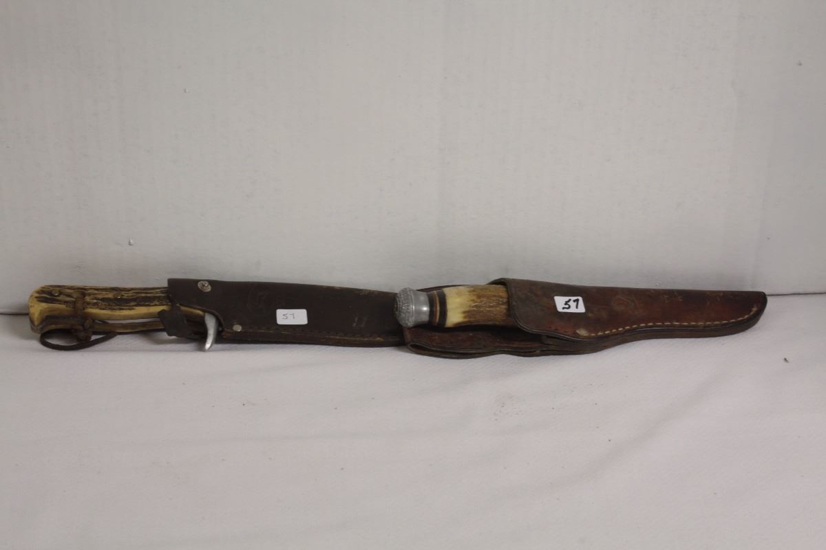 Bone handled hunting knives with leather sheaths