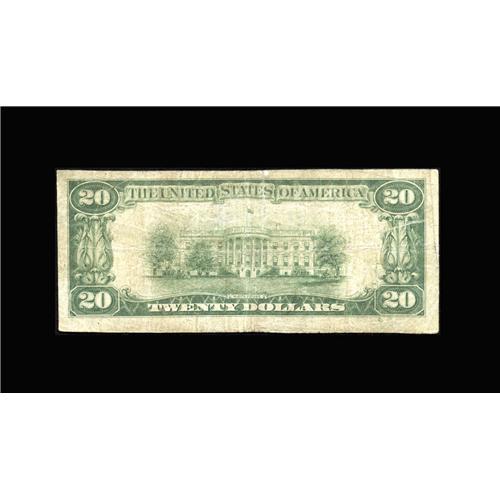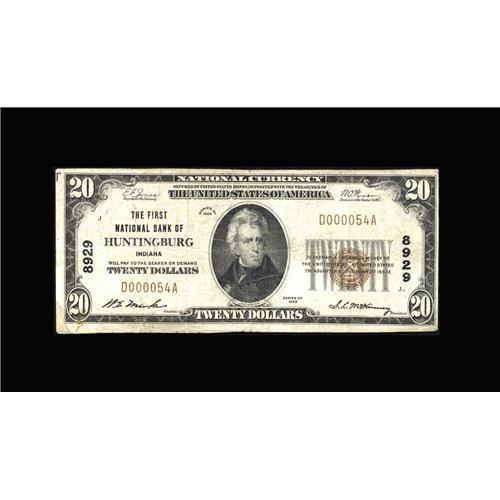 <B>Huntingburg, IN</B></I> - $20 1929 Ty. 1 <B>The First NB</B></I> Ch. # 8929<BR>This note has been expertly restored to close a one inch tear into the portrait area from the top. <B>Very Good+.</B></I>