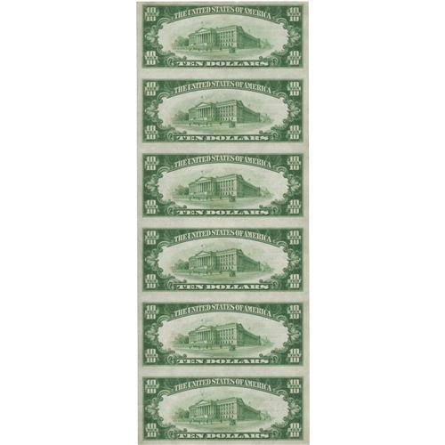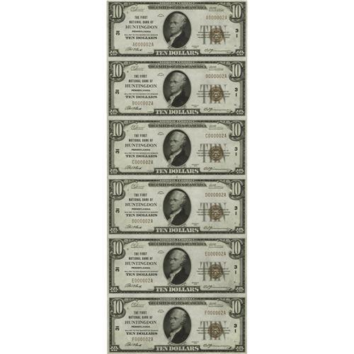 <B>Huntingdon, PA</B></I> - $10 1929 Ty. 1 <B>The First NB</B></I> Ch. # 31 Uncut Sheet<BR>This $10 Type One sheet is an all serial number 2 example. Light handling is observed on the bottom two notes. <B>Choice Crisp Uncirculated.</B></I><BR><BR><b>Shipping:</b> Coin/Currency (<a target="_blank" href="http://www.heritageauctions.com/common/shipping.php">view shipping information</a>)