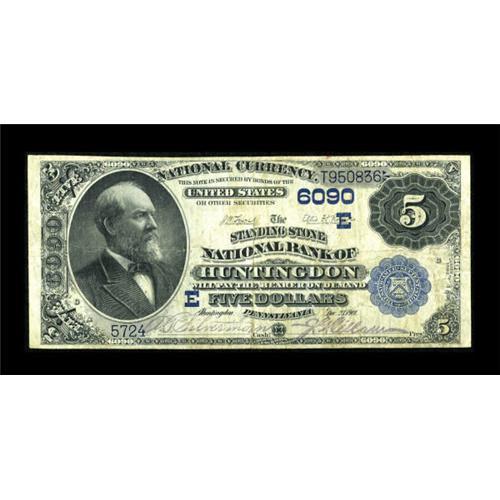 <B>Huntingdon, PA</B></I> - $5 1882 Value Back Fr. 574 <B>The Standing Stone NB</B></I> Ch. # (E)6090<BR> This is the only $5 Value Back in the census for this charter number. This is also the first time for any Value Back on this bank to cross the auction block since a Hickman-Oakes mail bid auction in March 1981. If any more encouragement is needed to bid, you can consider the unique and colorful bank title. <B>Fine-Very Fine</B></I>.<BR><BR><b>Shipping:</b> Coins & Currency (<a target="_blank" href="http://www.heritageauctions.com/common/shipping.php">view shipping information</a>)