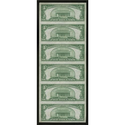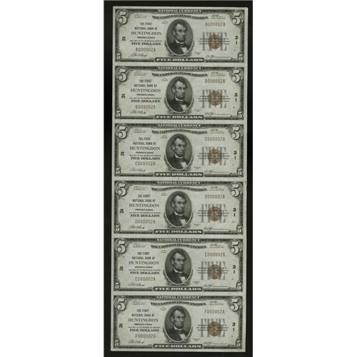 <B>Huntingdon, PA</B></I> - $5 1929 Ty. 1 <B>The First NB</B></I> Ch. # 31 Uncut Sheet<BR>This sheet is the first of three newly discovered all serial number 2 uncut sheets from this low charter number bank. These sheets are the first known Type 1 sheets on the bank. The bottom note exhibits a corner and diagonal fold and the fifth note has a tiny imperfection in the paper on the back. <B>Choice Crisp Uncirculated.</B></I><BR><BR><b>Shipping:</b> Coin/Currency (<a target="_blank" href="http://www.heritageauctions.com/common/shipping.php">view shipping information</a>)