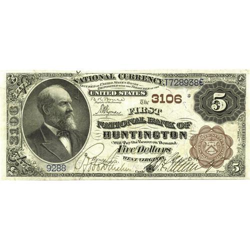 <B>Huntington, WV</B></I> - $5 1882 Brown Back Fr. 467 <B>The First NB</B></I> Ch. # 3106<BR>A most attractive example with a great layout. While this bank is quite easily available in Third Charter notes, this is one of only two Brown Backs recorded in the census, and the only one listed with a grade attached. Pen signed <B>Very Fine+++,</B></I> a note certain to please.