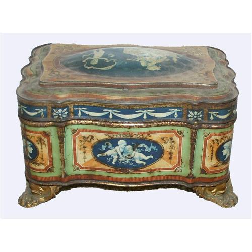 Huntley & Palmers Biscuit Tin in shape of a jewelry box measures approximately 8" x 5 ½" x 4 ½" H. The box is decorated with cameos of women, children & cherubs and sit on four applied, decorative feet. The bottom is marked with the Huntley & Palmers Biscuits graphic logo. There is considerable wear overall to the box.