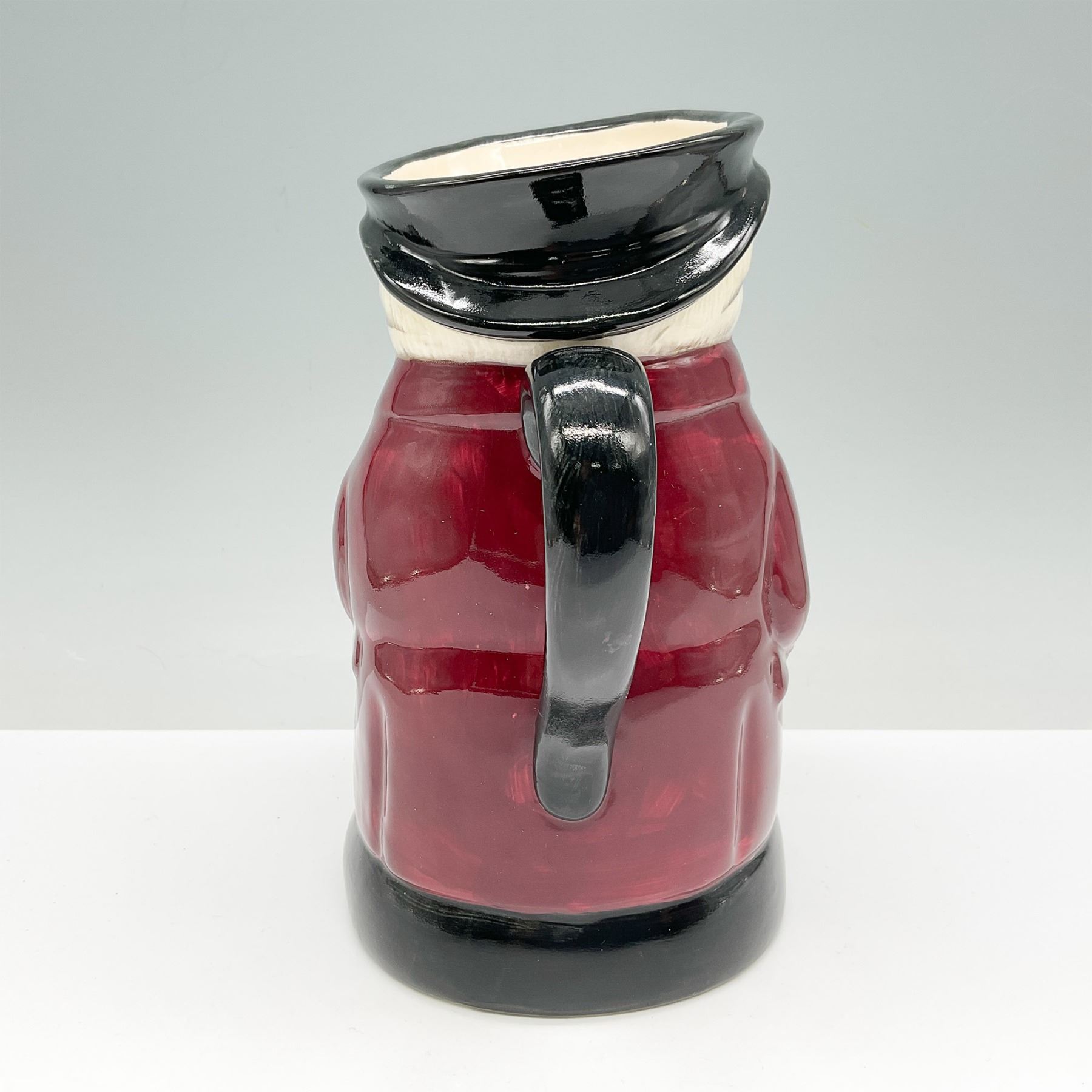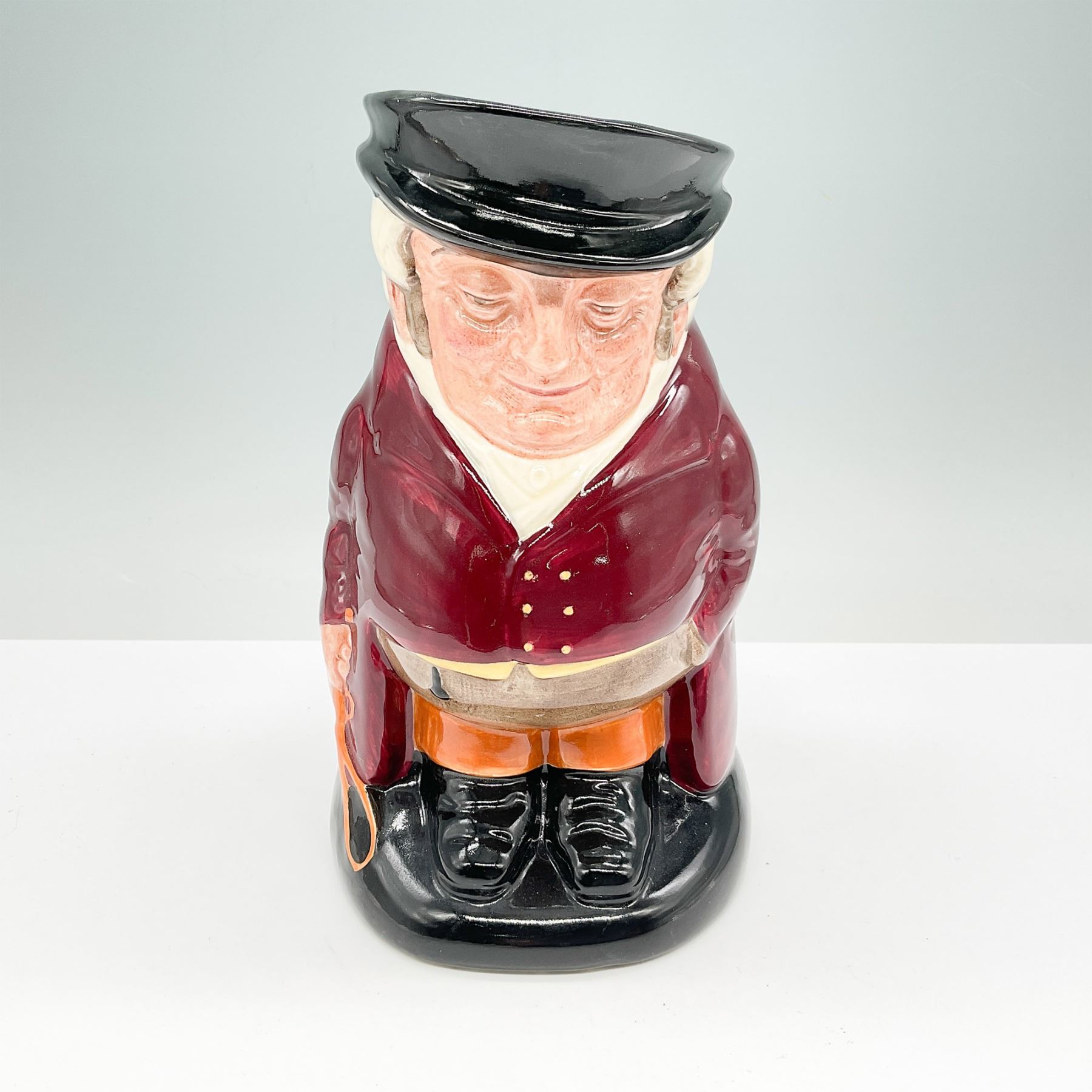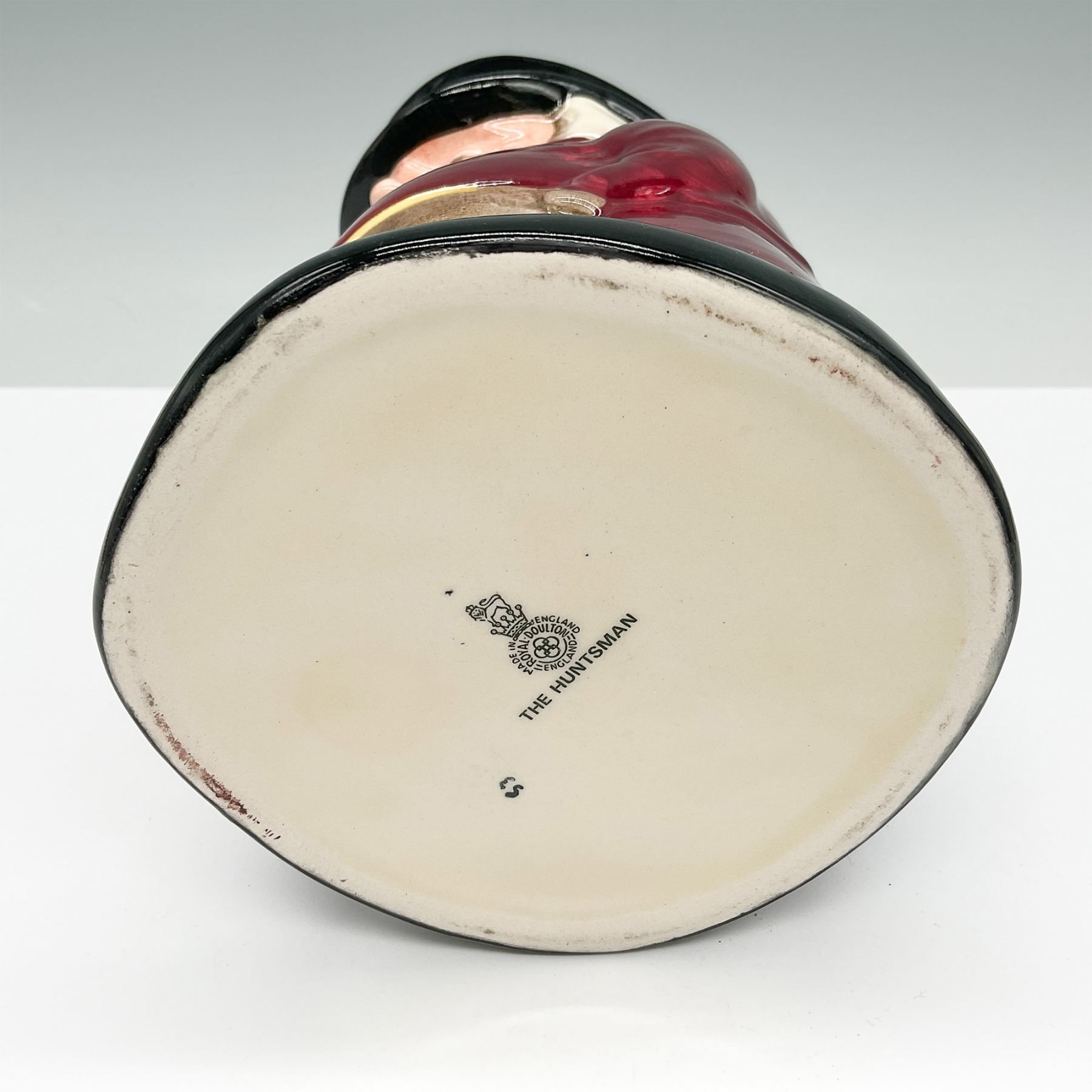 Royal Doulton The Huntsman character jug, made in England, features a finely detailed depiction of a traditional English huntsman. This classic ceramic jug showcases hand-painted detailing with a burgundy coat, orange breeches, and a black hat, highlighting Royal Doulton's craftsmanship. The base is stamped with the Royal Doulton hallmark, indicating authenticity, and labeled The Huntsman. A timeless piece of British ceramic artistry.