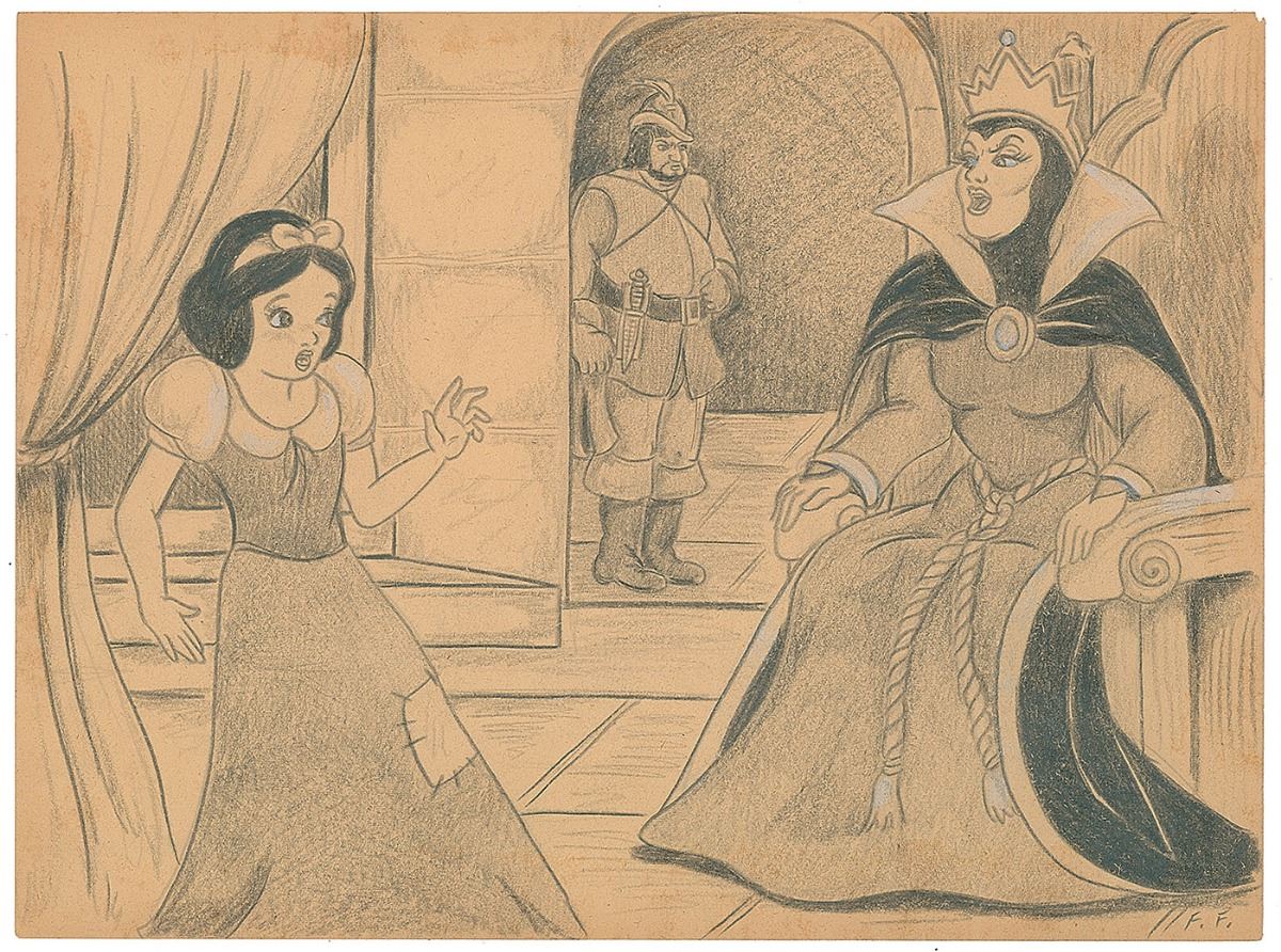 (Walt Disney Studios, 1937) Original concept drawing from Snow White and the Seven Dwarfs by Frank Follmer, depicting the Evil Queen intimidating Snow White while Herbert the Huntsman looks on from an archway. Initialed in the lower right corner by the artist, “F. F.” Accomplished in graphite and colored pencil on a sheet of untrimmed 12 x 9 animation paper. Images measure 3.5 x 7 (Snow White), 6 x 8.5 (Queen), and 1.75 x 5 (Huntsman). In fine condition.