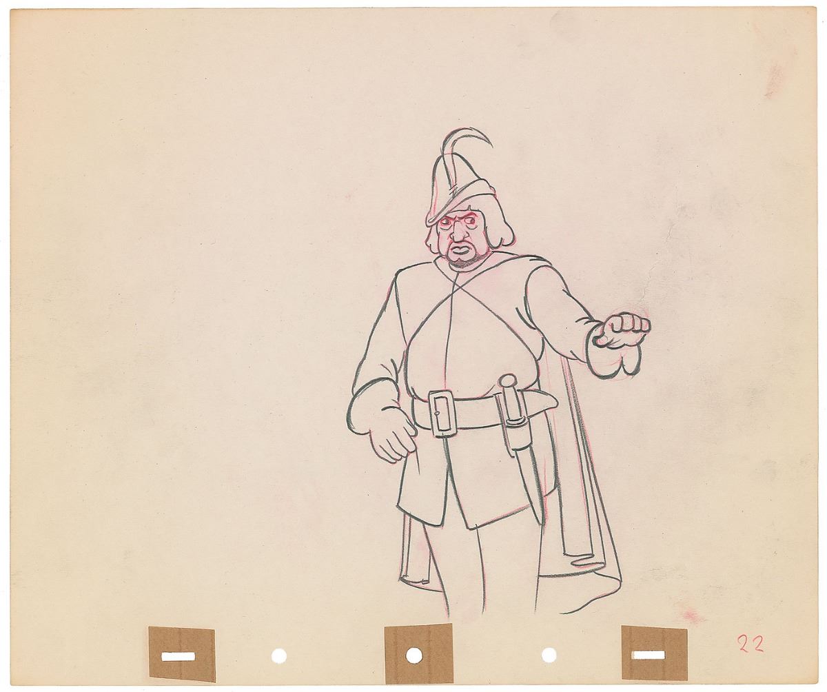 (Walt Disney Studios, 1937) Scarce original production drawing of Herbert the Huntsman from Snow White and the Seven Dwarfs. Accomplished in graphite and colored pencil on untrimmed 12 x 10 animation paper. Image measures 4.5 x 7.25. In fine condition. The Huntsman remains a decidedly uncommon character.