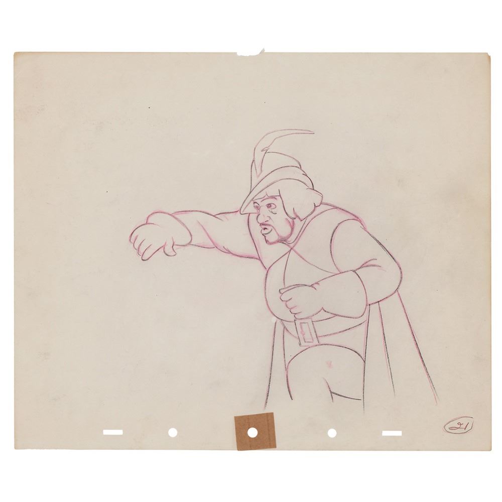 (Walt Disney Studios, 1937) Uncommon original production drawing featuring the Huntsman from Snow White and the Seven Dwarfs, showing him crouched in his full cape and hunting attire. Accomplished in graphite and colored pencil on untrimmed 12 x 10 animation paper, marked "21" in the lower right corner. Image measures 7.5 x 7. In fine condition. The Huntsman remains a decidedly uncommon Disney character, as he appears only briefly in Snow White.
