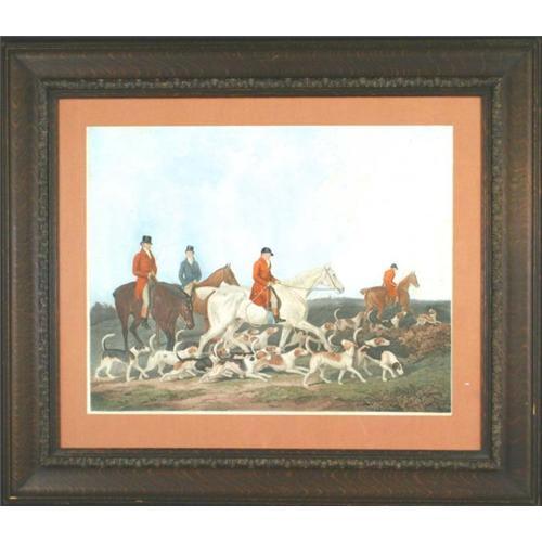 The call of the hunt can be imagined by the lithograph entitled ?Huntsmen?. This picture accurately and skillfully captures the feel of the hunt and the energy that takes place between the horse and rider by the artist?s representation and modeling of the subjects. Realistically rendered animals seem full of motion by the artist interpretation of the animals? anatomy. The sky is excellently done and brings vivacious life to the picture. This skillfully rendered piece is surrounded by a outstanding mahogany grained, decorative edged frame, and is bordered by a terracotta mat that matches the vivid colors of this fascinating work. The frame and lithograph measures a total of 30.75?x 35.5?. This picture would be a great addition to any art or horse enthusiast?s collection and is remarkably priced.