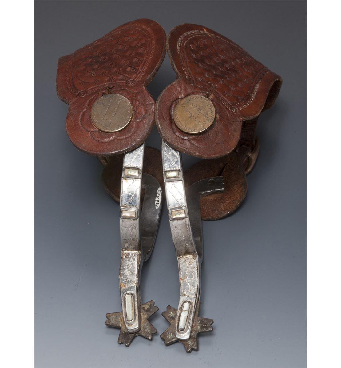 Huntsville Prison Spurs. Prisonmade spurs with narrow, upturned heel with stationary buttons, drooping shank with 5-point spoke rowel. 1 ¼” band and shank mounted in silver, with abalone shell set in silver. Period tooled straps, basket weave design.