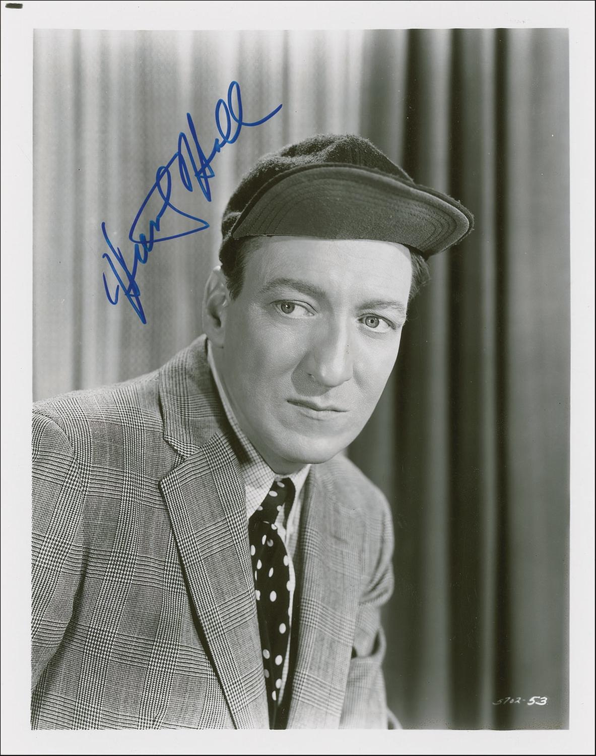 Glossy 8 x 10 photo of a suit-wearing Hall sporting a turned up baseball cap, signed in blue felt tip. In fine condition.