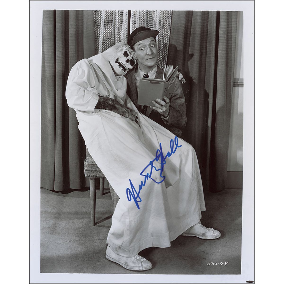 Quirky glossy 8 x 10 photo of Hall reading a book with a skeletal monster sitting on his lap, signed in blue felt tip, “Huntz Hall.” In fine condition.