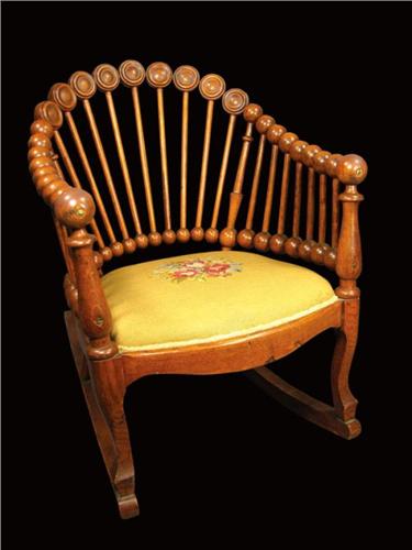 Rare Hunzinger Lollipop Oak Rocking Chair, needle point seat. George Hunzinger made furniture in the 1880s and 90s. His unique style is highly sought after today by prominent furniture enthusiasts. Excellent original condition.