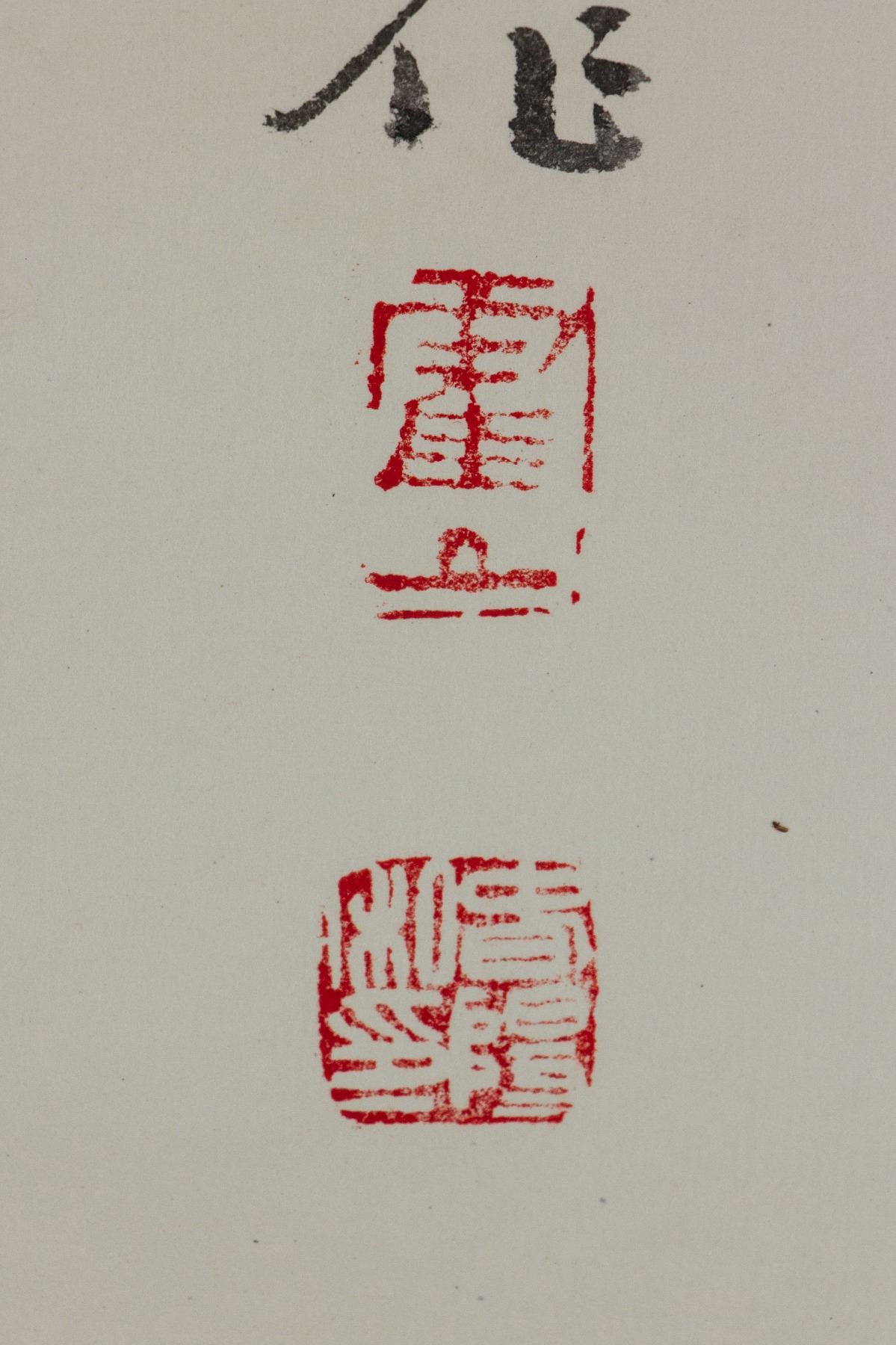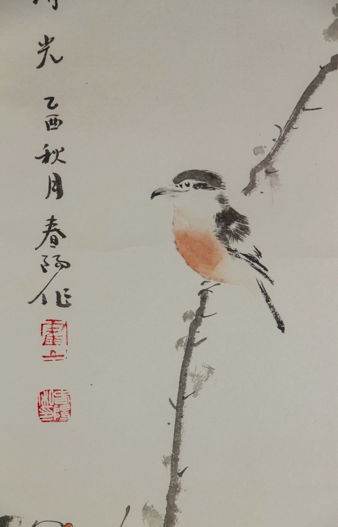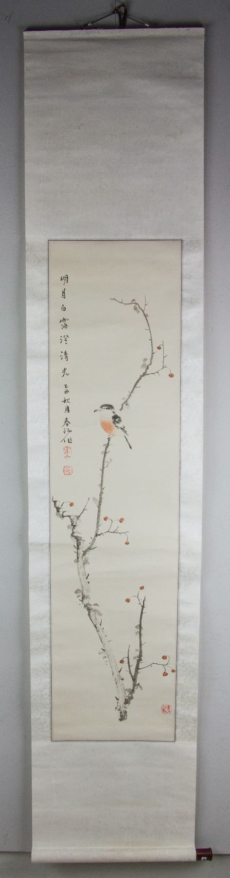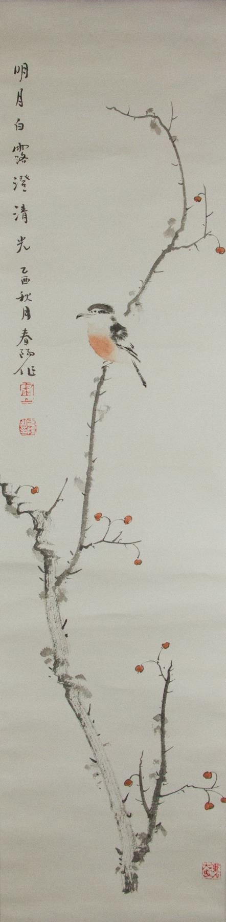 Bird standing on plum tree; Chinese ink and watercolour on paper; hanging scroll; signed Huo Chunyang (b.1946); 126 cm x 32 cm