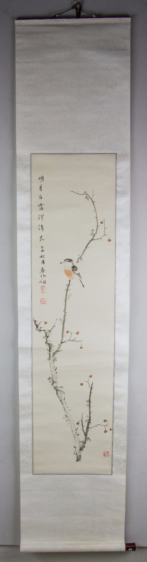 Bird standing on plum tree; Chinese ink and watercolour on paper; hanging scroll; signed Huo Chunyang (b.1946); 126 cm x 32 cm