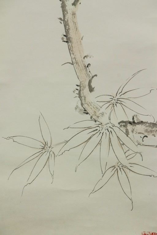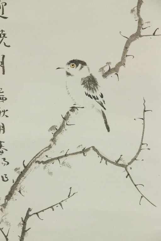 Sparrow on plum tree; Chinese ink and watercolour on paper; hanging scroll ; signed Huo Chunyang (b.1946); inscribed with 3 artist seals; 126 cm × 31 cm