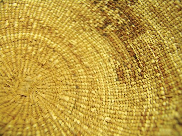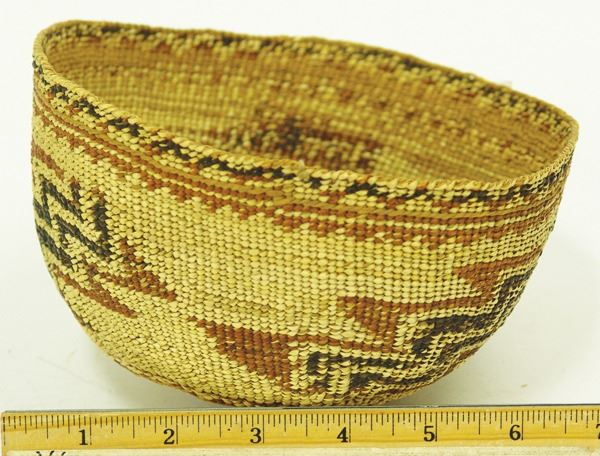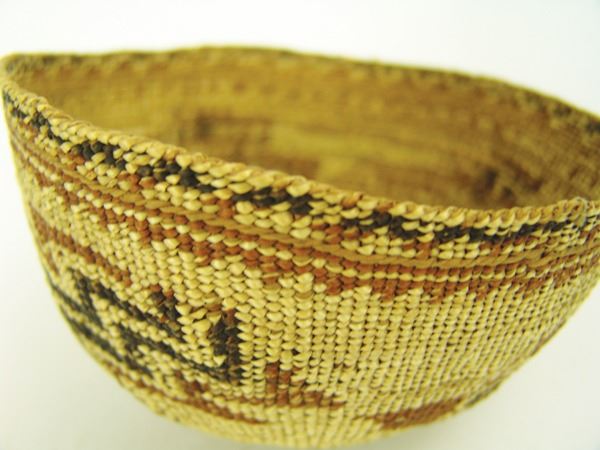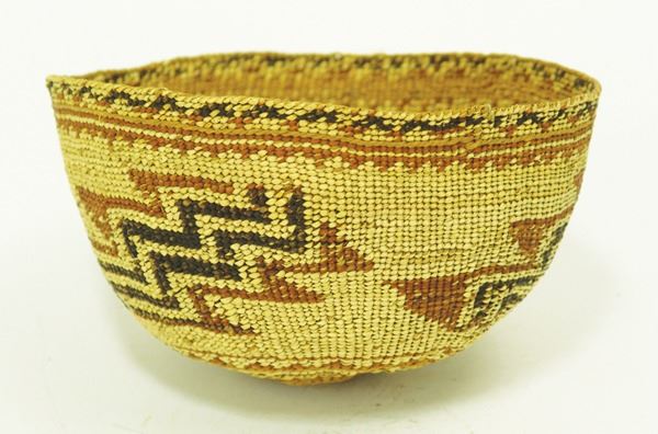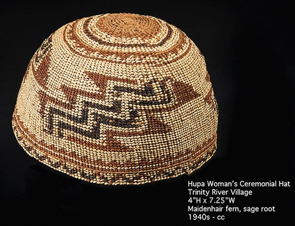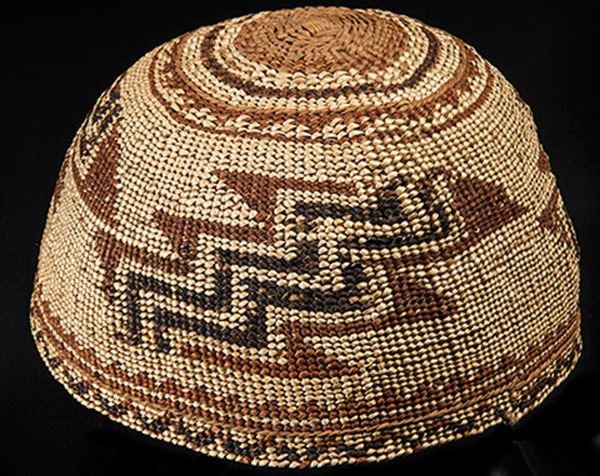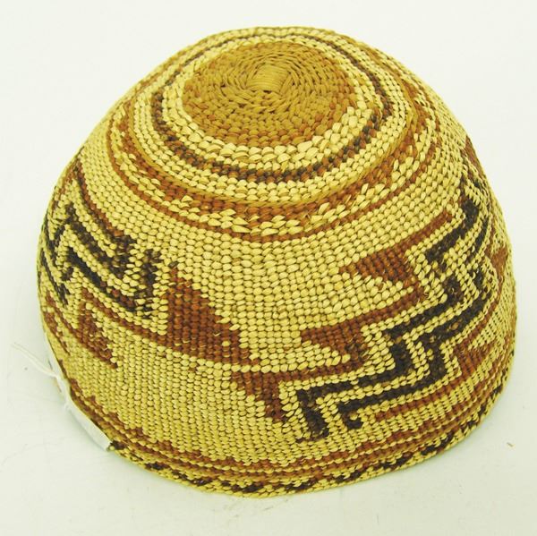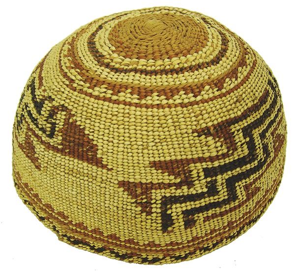 Traditional, fine weave basketry hat/cap with intricate geometric designs done in half-twist overlay. Very good condition.Early 1900s4" x 7-1/4"