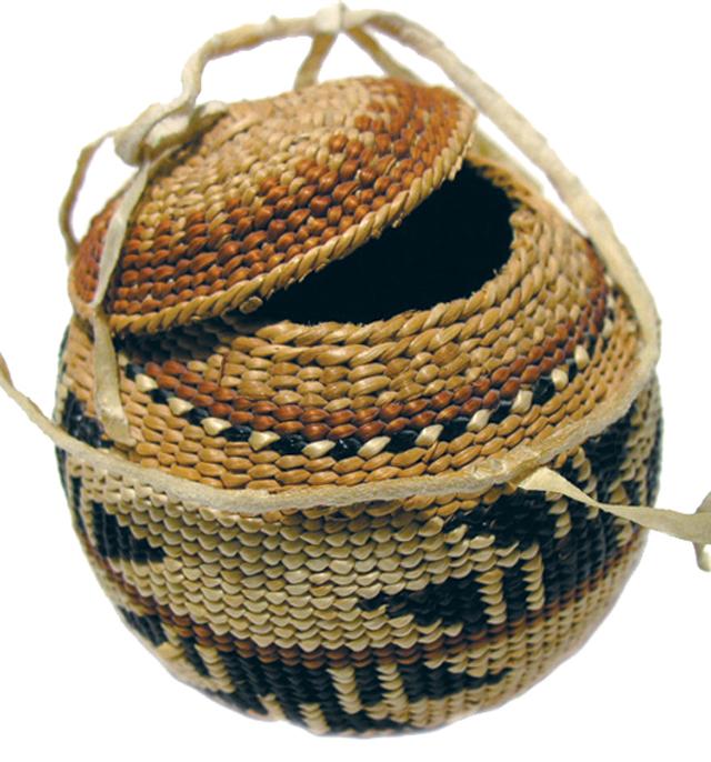 Mid 1900s, Superb miniature polychrome tobacco basket with classic geometric triangle motif; extra tight weave. 2-1/4" x 2"