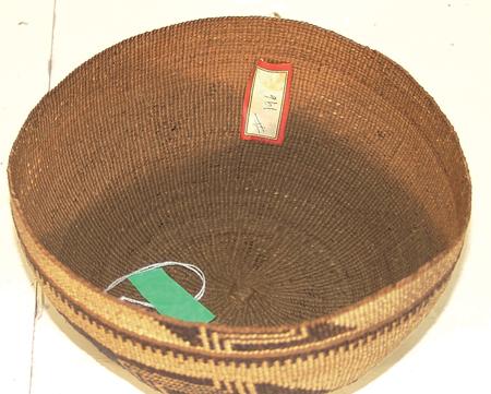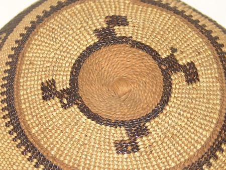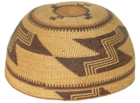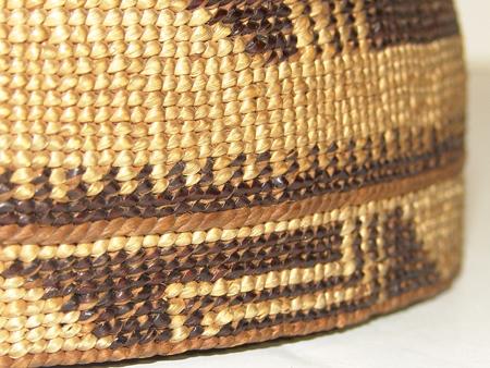 Extra fine weave basketry hat with striking exterior stacked rhomboid design. Condition: excellent. 3-1/2" high x 7" diameter.
